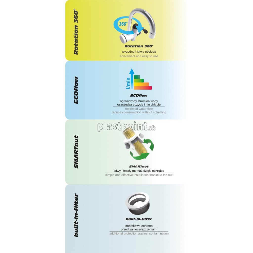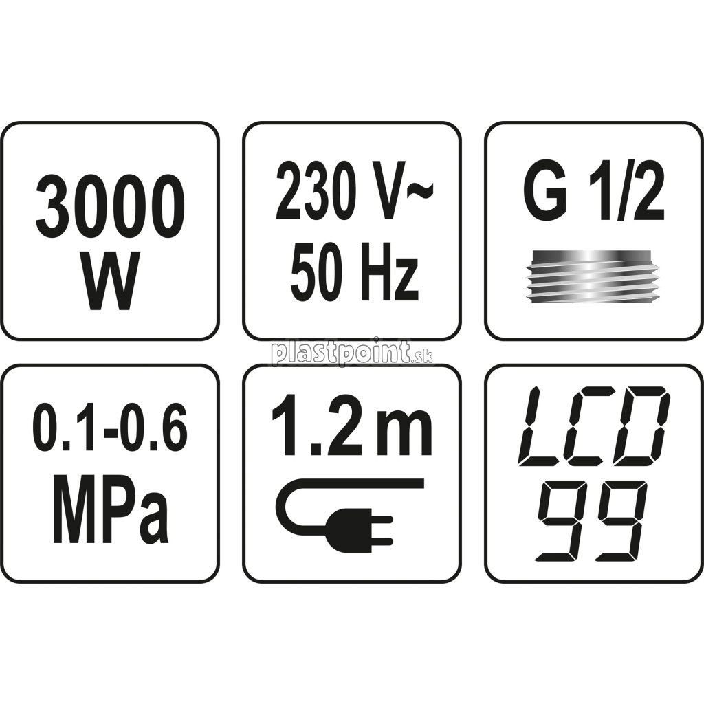 Prietokový ohrievač s výkonom 3000W, umožňuje ohriať vodu na 60 ° C za 5 sekúnd. Ľahko čitateľný LED displej, ktorý umožňuje kontrolovať teplotu vody. kábla