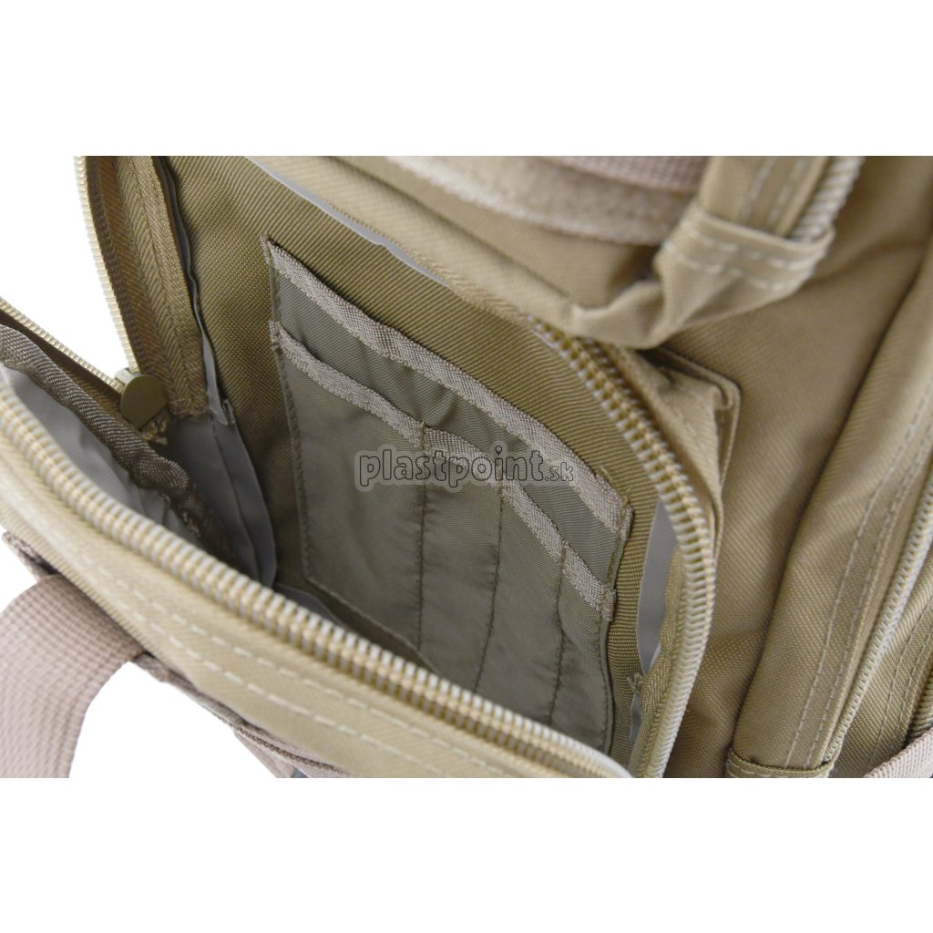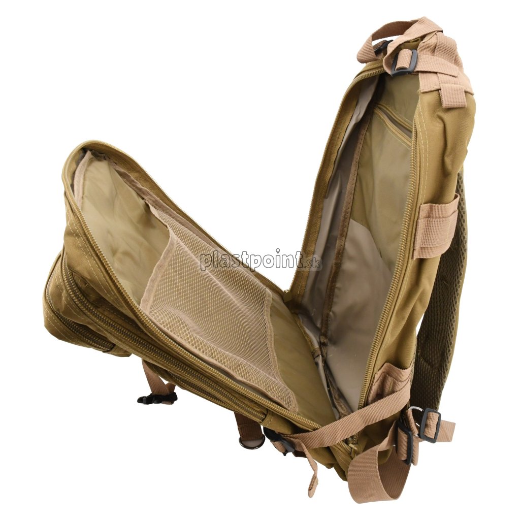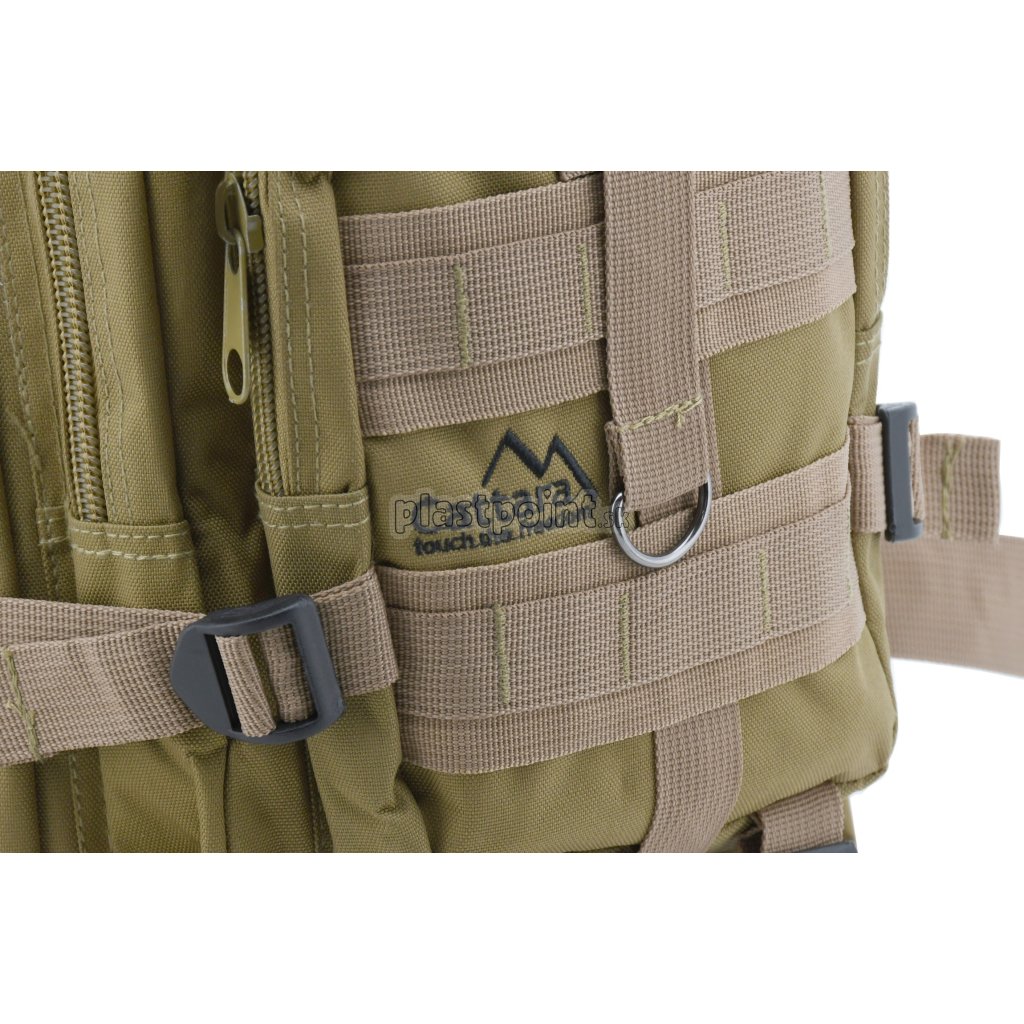Z čelnej strany a na bokoch je opatrený Molle systémom pre uchytenie ďalšieho vybavenia. Vrecká sú osadené pevným dvojcestným zipsom. Vnútorné vrecká a sieťové vrecko sú doplnené o pútka na bezpečné nosenie drobných predmetov. Jedno z vnútorných vreciek je vybavené klasickým zipsom a zadné vetrané vrecko je vybavené suchým zipsom.