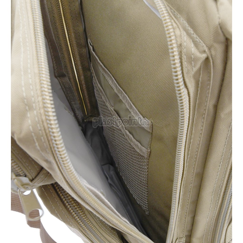Objemný, viacvreckový, polstrovaný batoh vybavený 2x hlavnými, 2x vedľajšími, 4x vnútornými a 1x zadným vetraným vreckom.