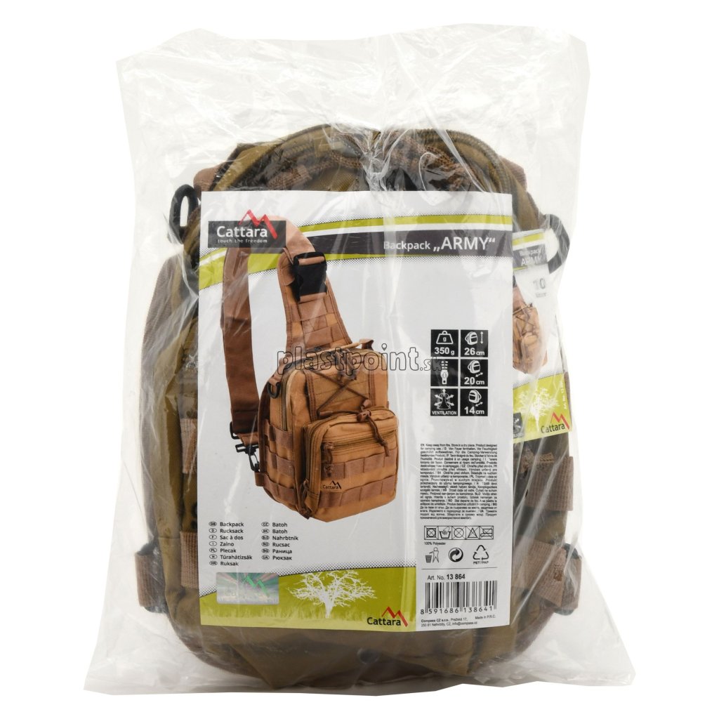 Objemný, viacvreckový batoh cez rameno opatrený 1x hlavným, 2x vedľajšími, 3x vnútornými a 1x zadným vetraným vreckom.