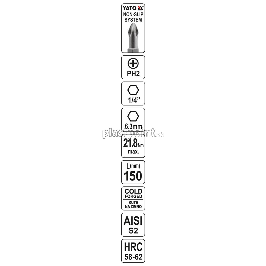 Bit je kovaný za studena z vysoko kvalitného materiálu AISI S2 s tvrdosťou HRC 58-62 a maximálnym krútiacim momentom. krížový, skrutkovacie veľkosti PH2 dĺžky 150 mm.