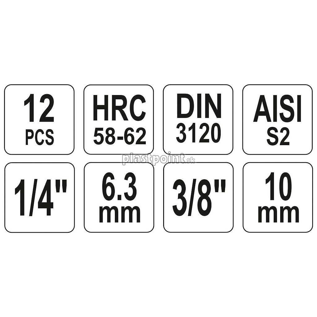 1/4' a 3/8' račne. V sade je kovový držiak bitov a samotné bity T8-T55. Spĺňa normu DIN 3120 pre vysoko-zaťažovateľné nástavce.