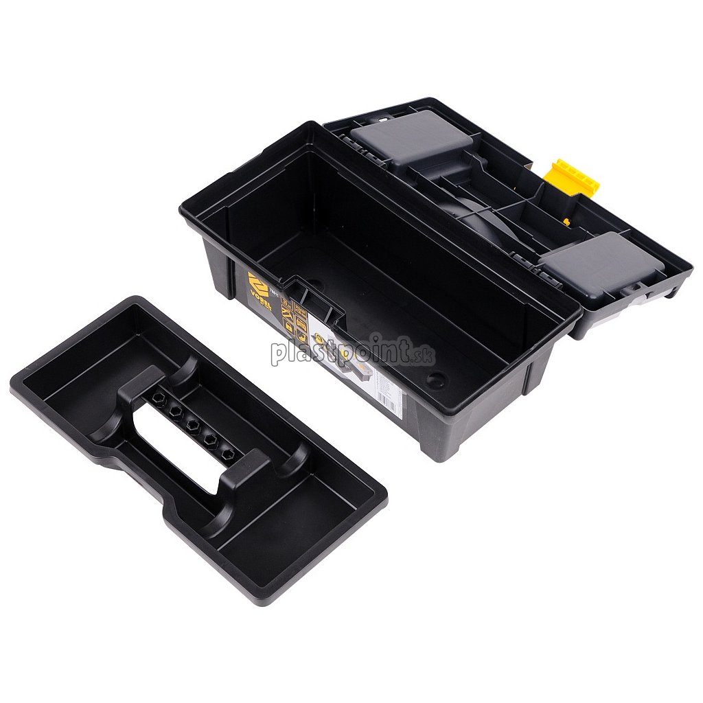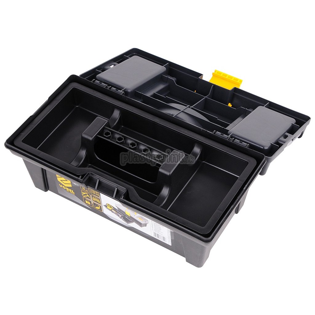 Plastový kufor s dvoma pevnými organizérmi na veku a vnútornou vyberateľnou vložkou na drobné predmety.