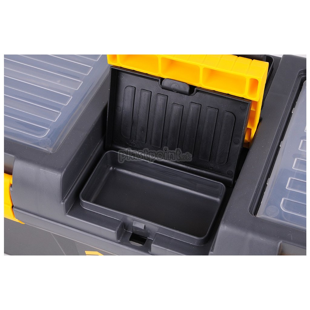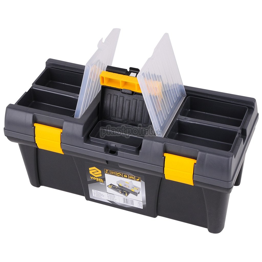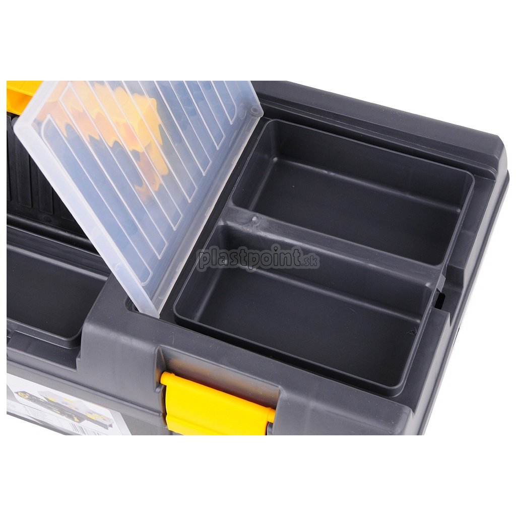 Plastový kufor s dvoma vyberateľnými organizérmi na veku a vnútornou vyberateľnou vložkou na drobné predmety.