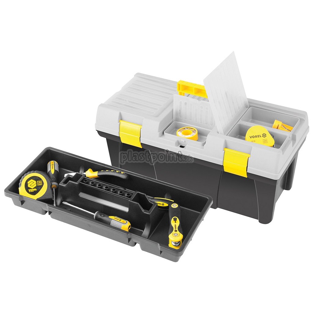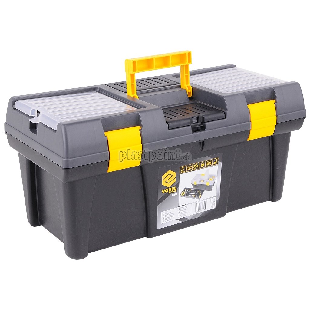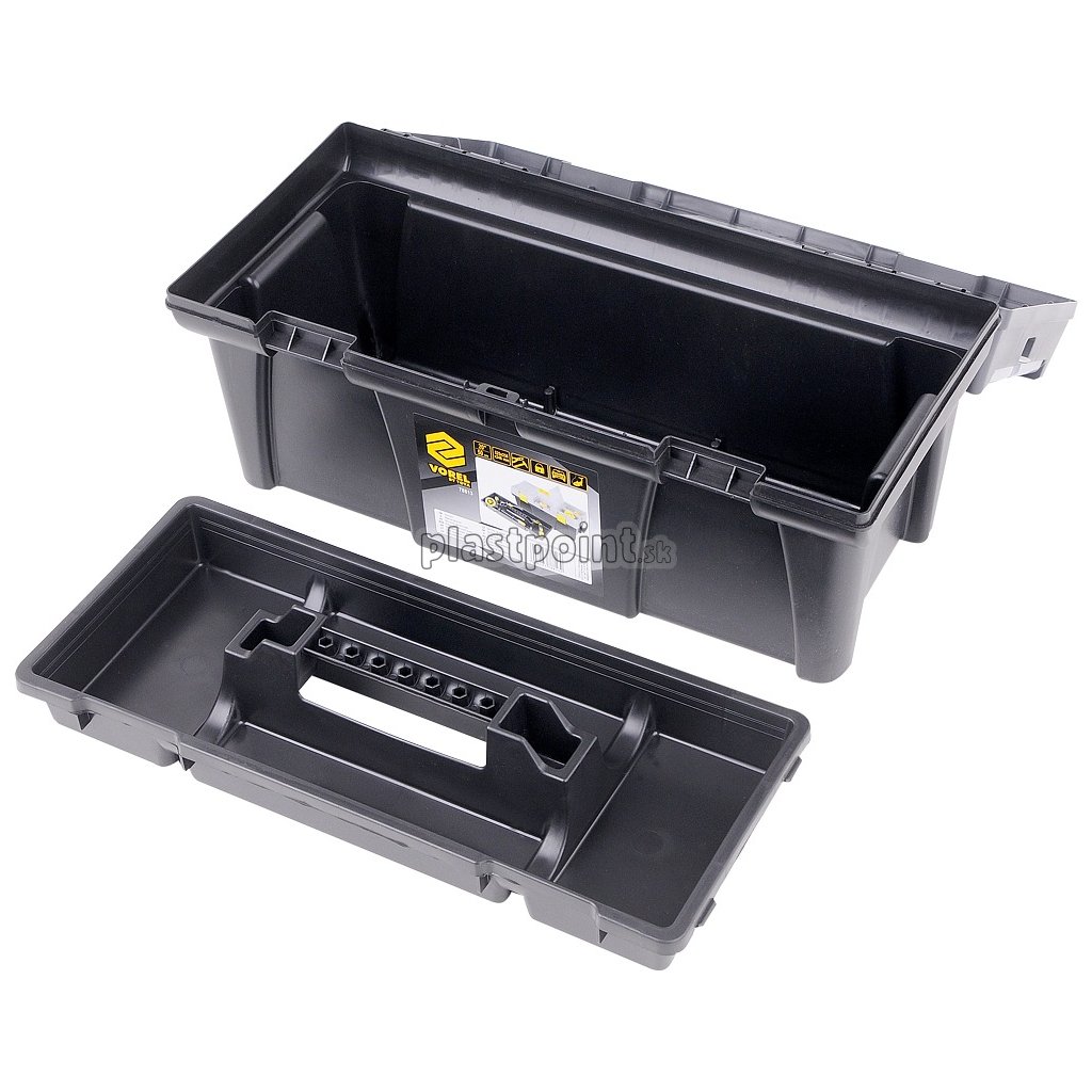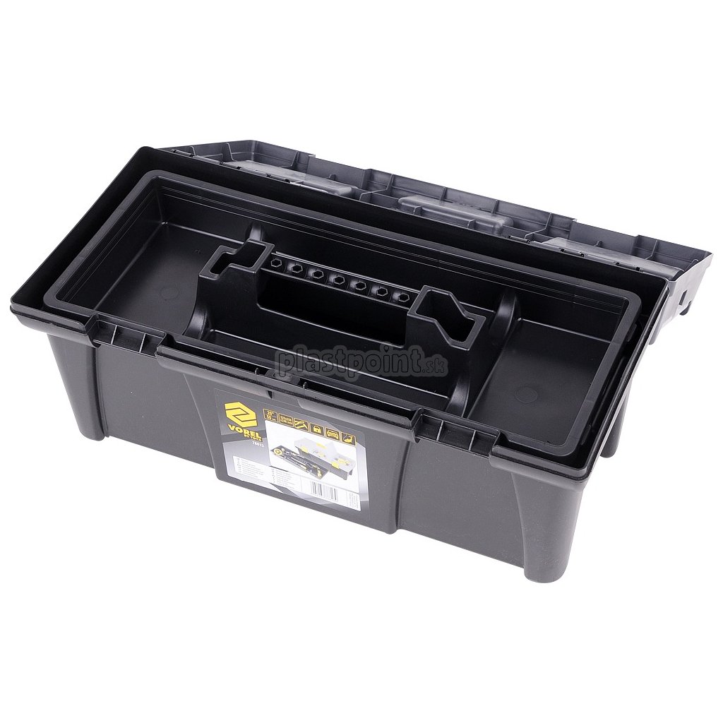 Plastový kufor s dvoma vyberateľnými organizérmi na veku a vnútornou vyberateľnou vložkou na drobné predmety.