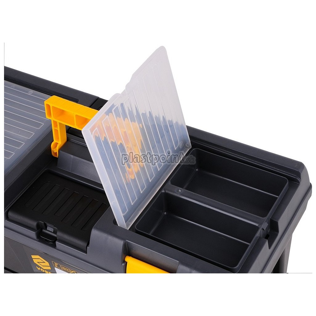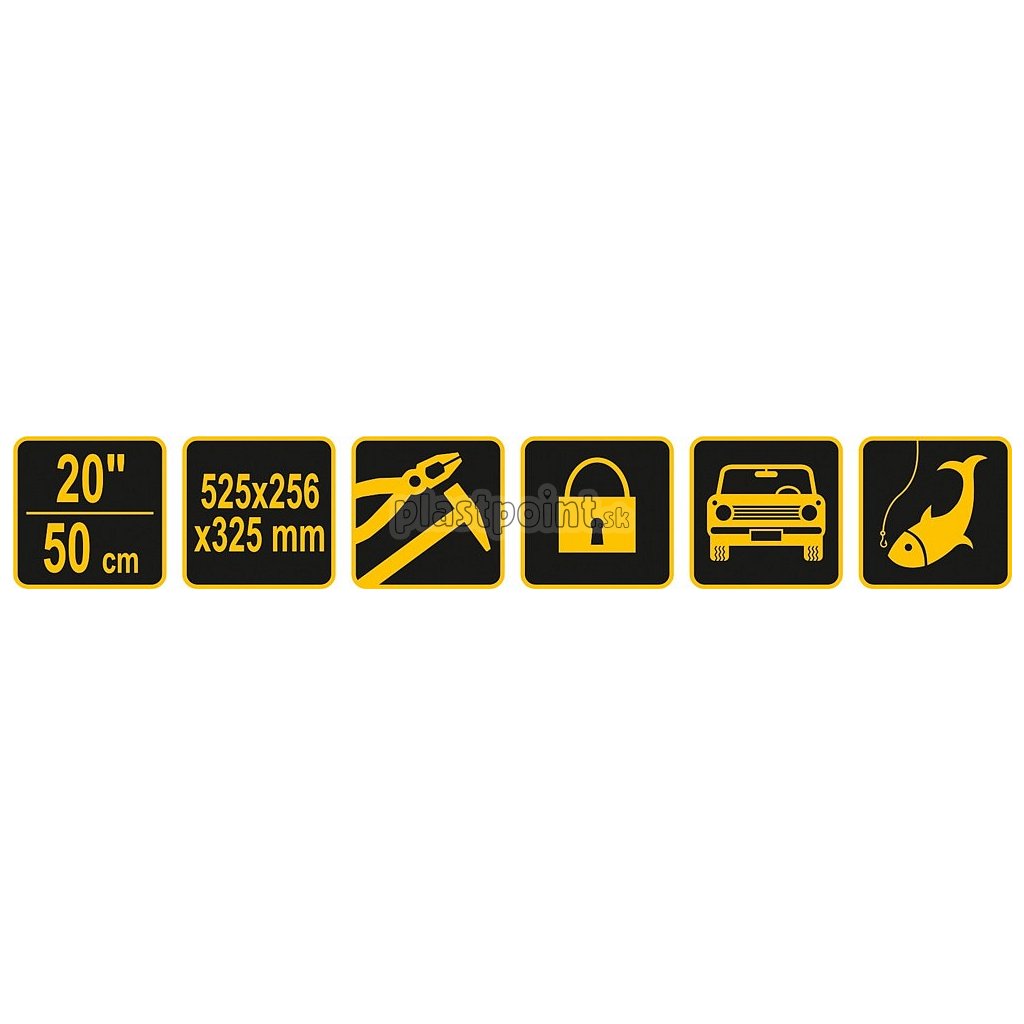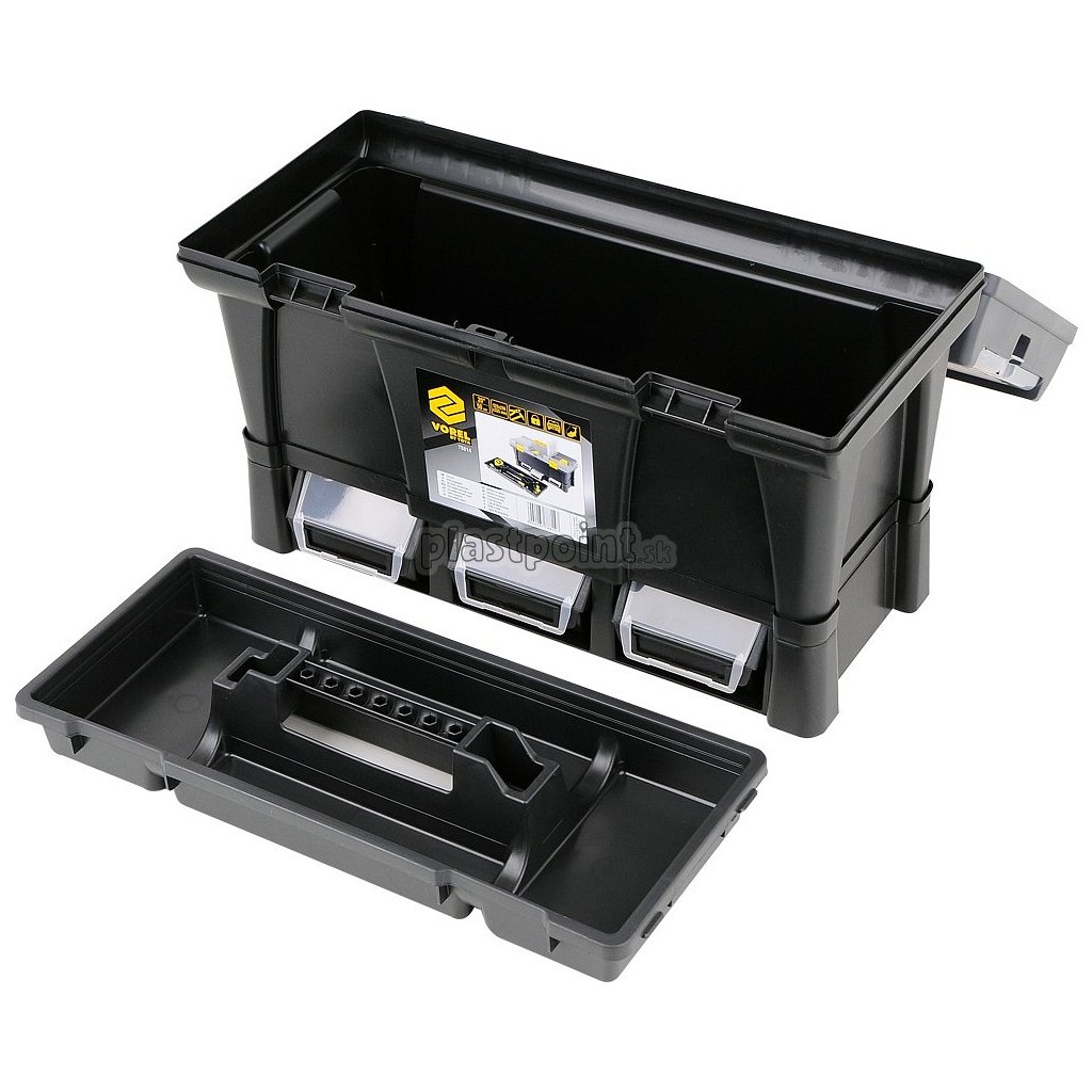 Box na náradie 20"s modulom s 3 úložnými priehradkami. Rozmery 52,5x25,6x32,5 cm. Nosnosť boxu je max. 25 kg a modul navyše 3 kg. Box v hornom kryte má vstavané 4 organizéry s chlopňami. rukoväte na prenášanie. Vnútri je odnímateľná priehradka na náradie.