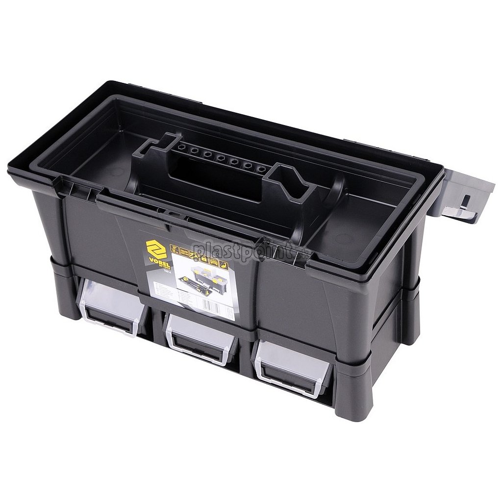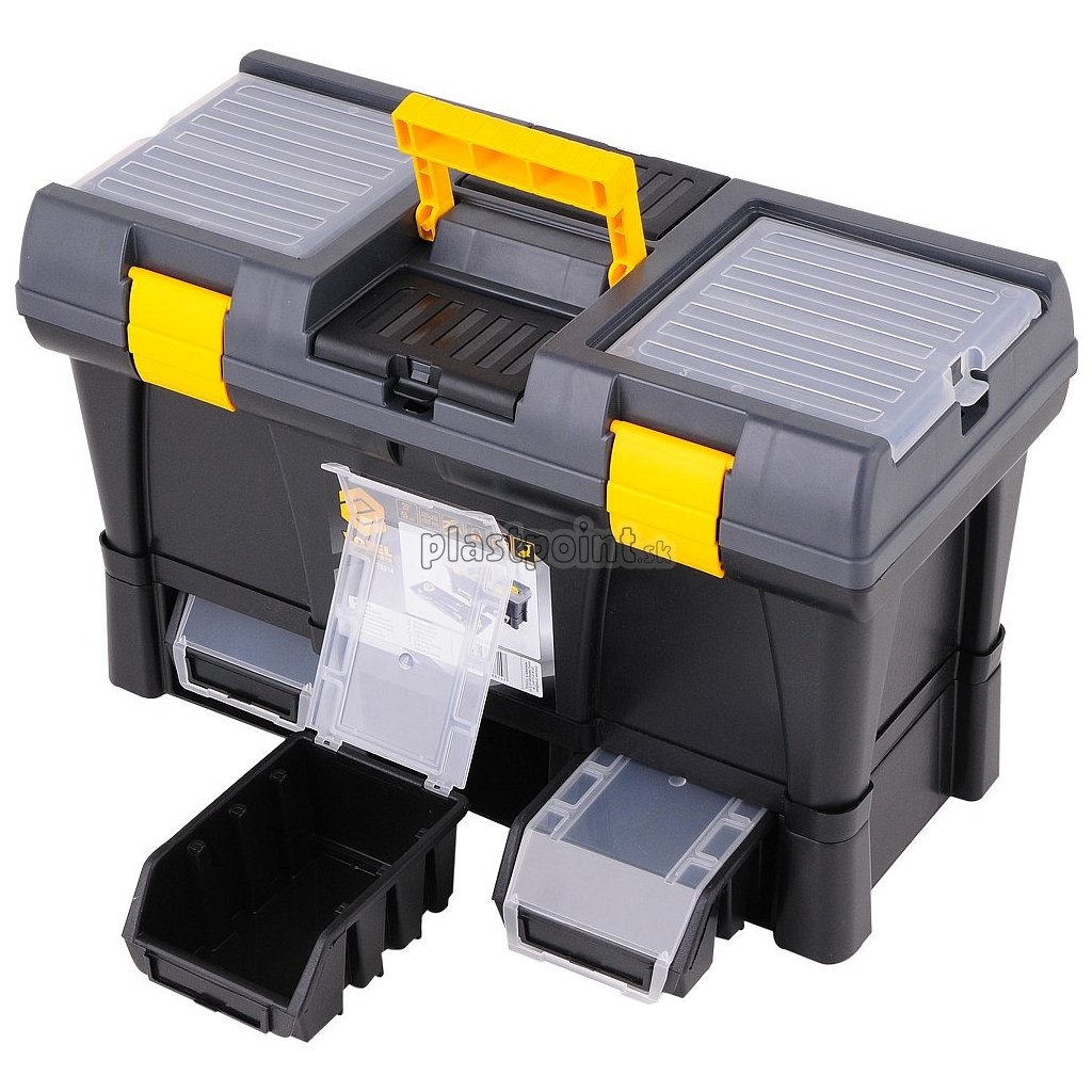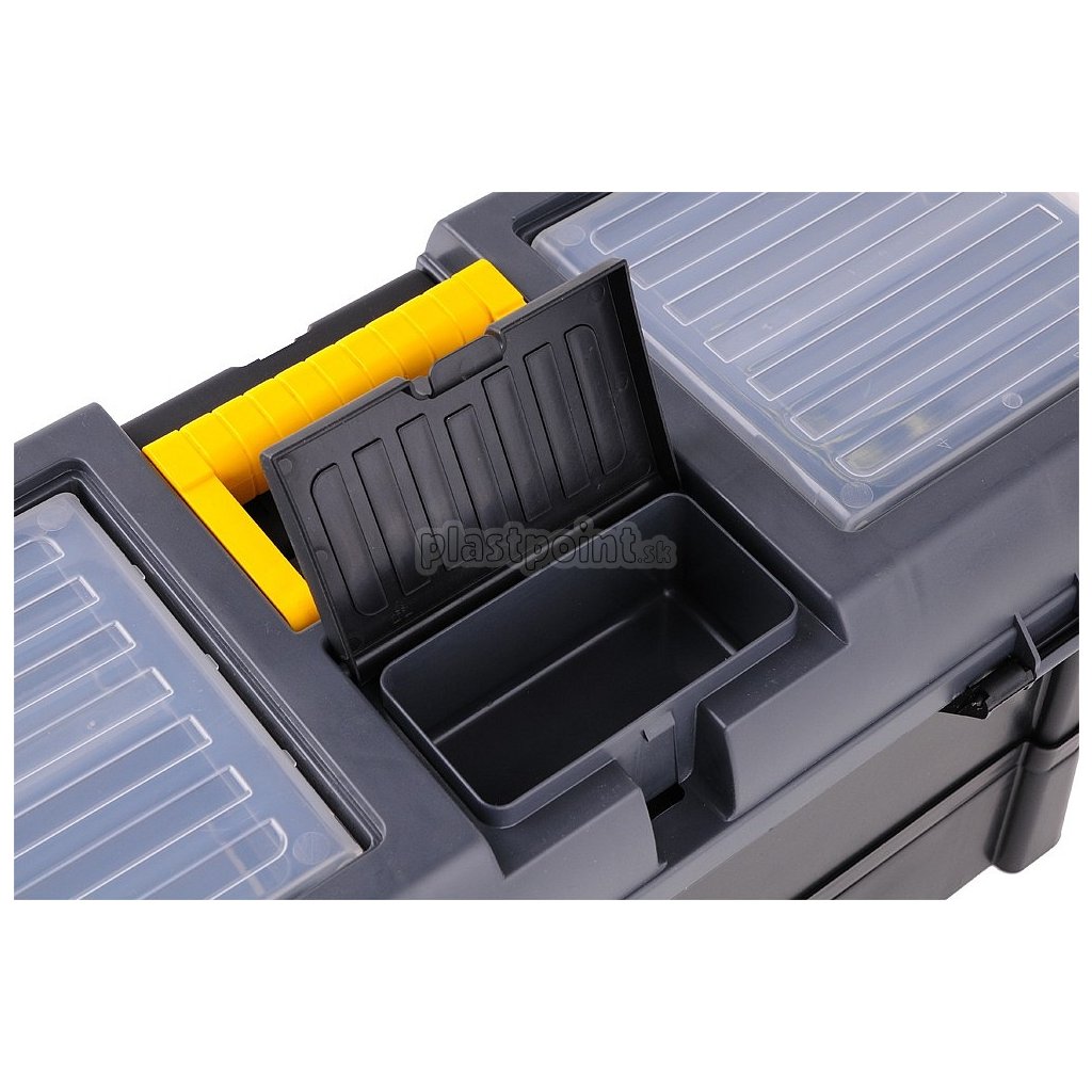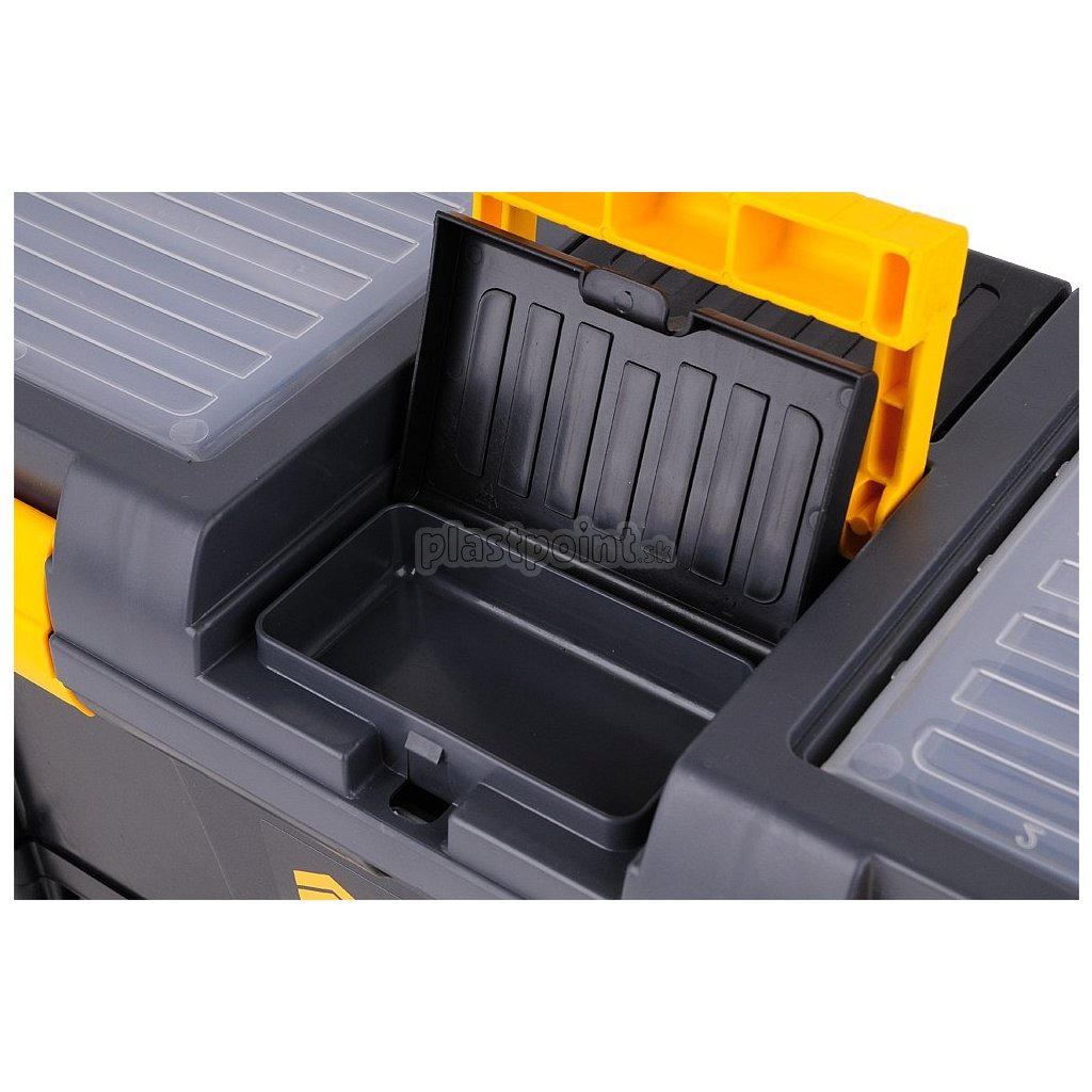 Box na náradie 20"s modulom s 3 úložnými priehradkami. Rozmery 52,5x25,6x32,5 cm. Nosnosť boxu je max. 25 kg a modul navyše 3 kg. Box v hornom kryte má vstavané 4 organizéry s chlopňami. rukoväte na prenášanie. Vnútri je odnímateľná priehradka na náradie.
