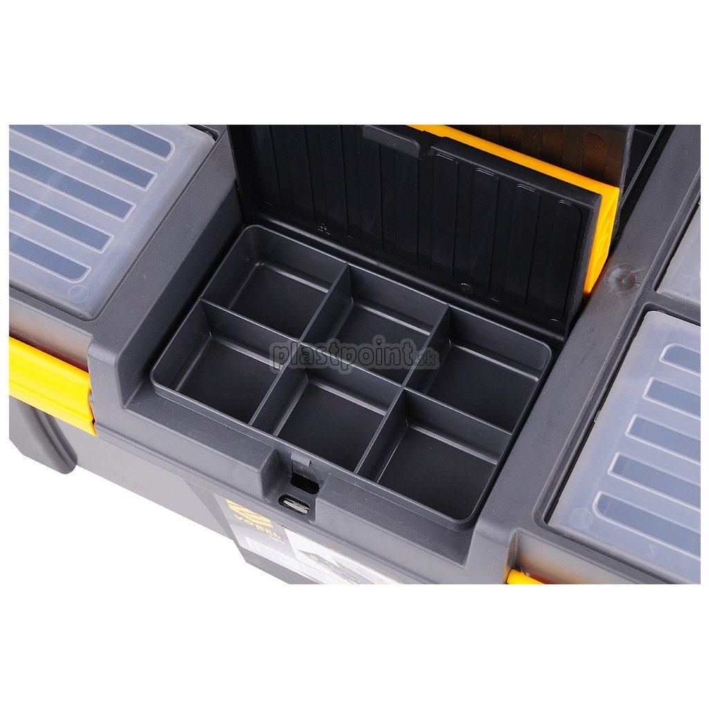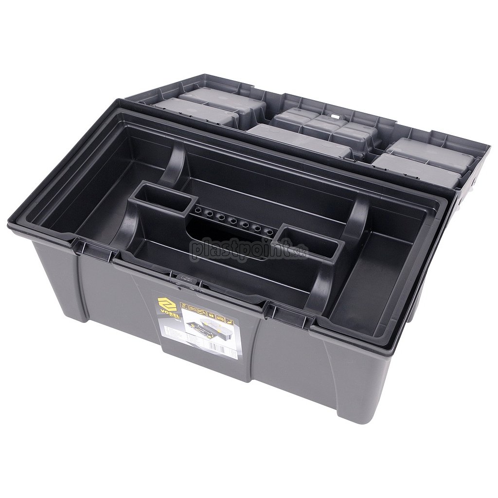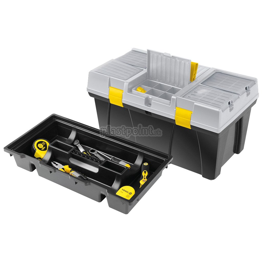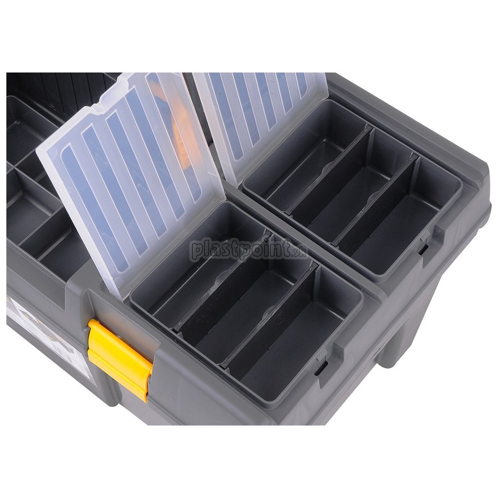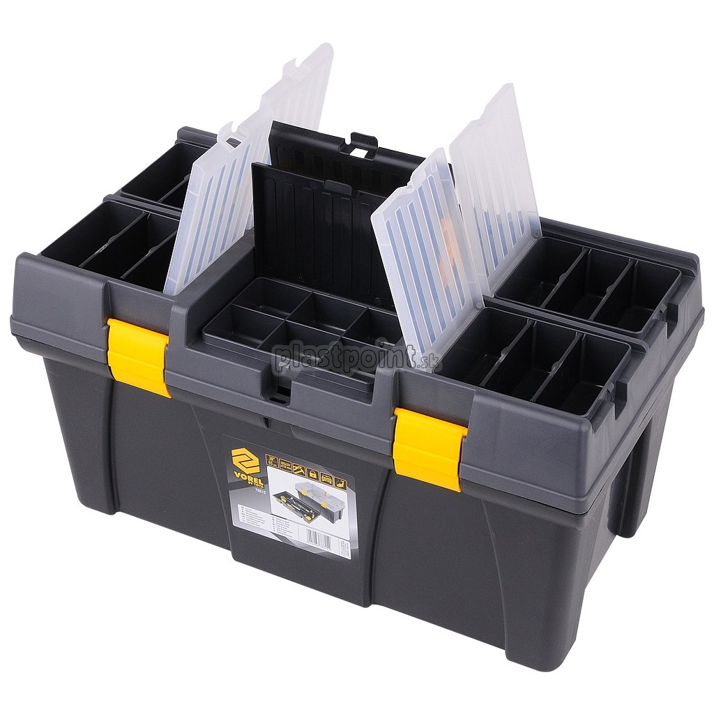 Plastový kufor s dvoma vyberateľnými organizérmi na veku a vnútornou vyberateľnou vložkou na drobné predmety.