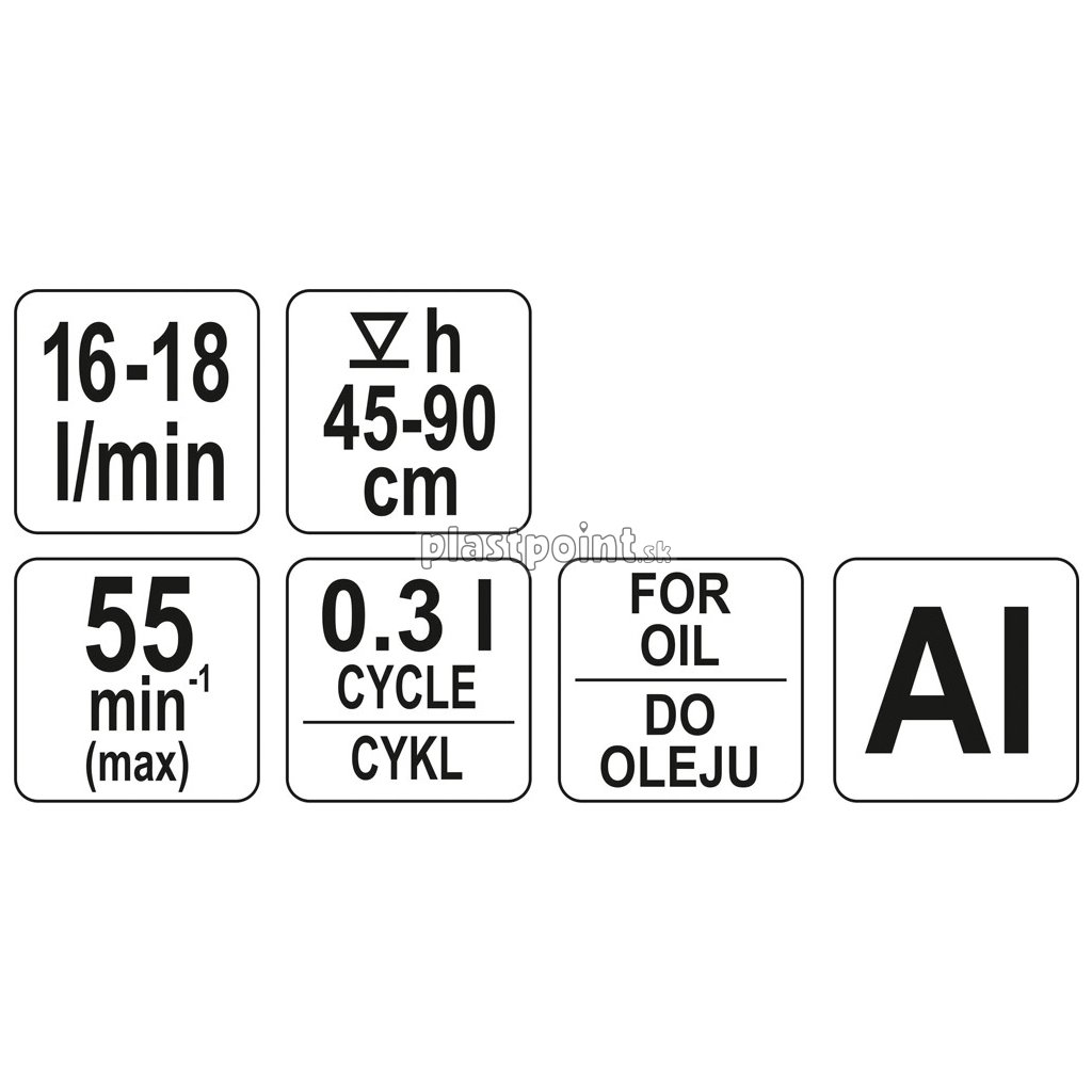 Kapacita čerpania 16 - 18 l/min, jeden pracovný pohyb páky sa rovná čerpaniu približne 0,3 l.