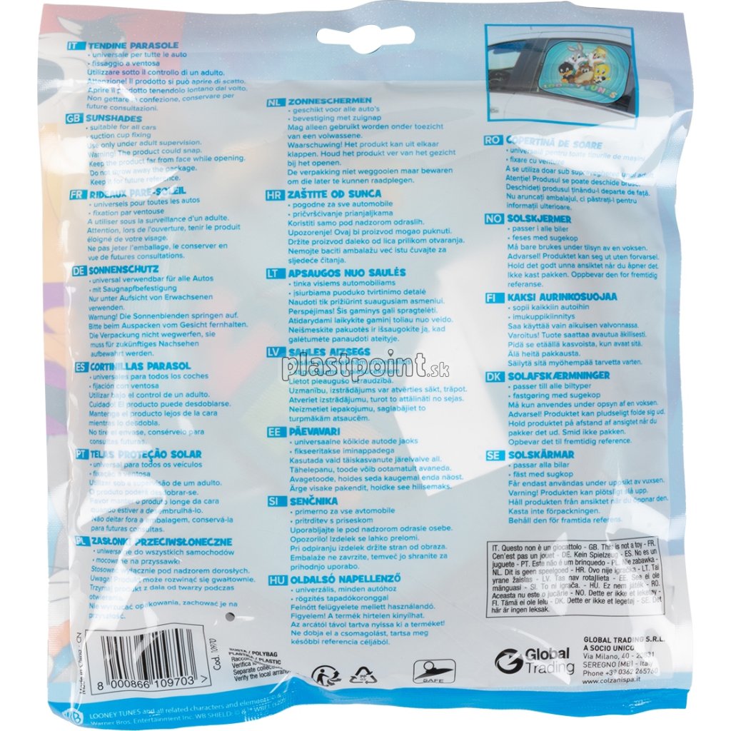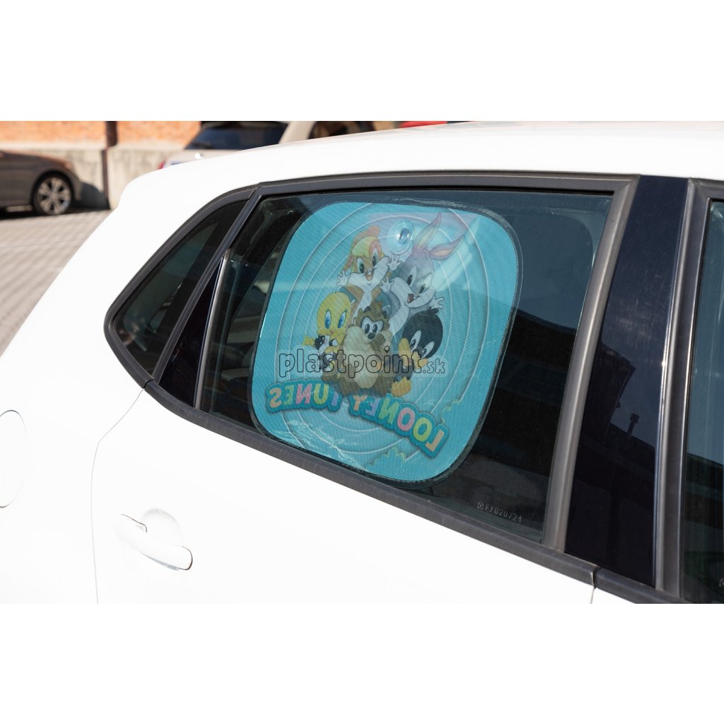 Slnečné clony bránia prenikaniu slnečných lúčov do vozidla. Sada obsahuje 2 ks cloniek s detským motívom Looney Tunes. Sú určené na zadné, alebo bočné sklá automobilu.