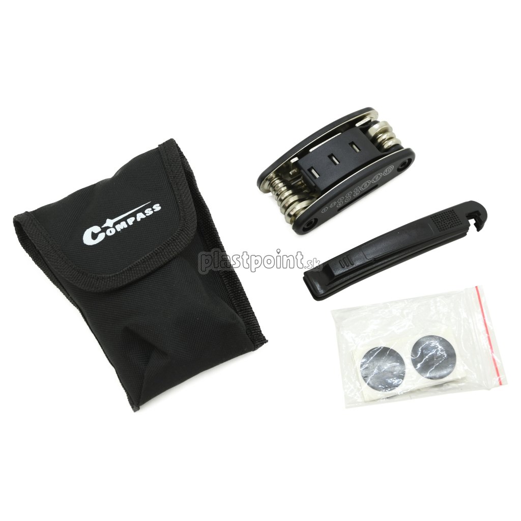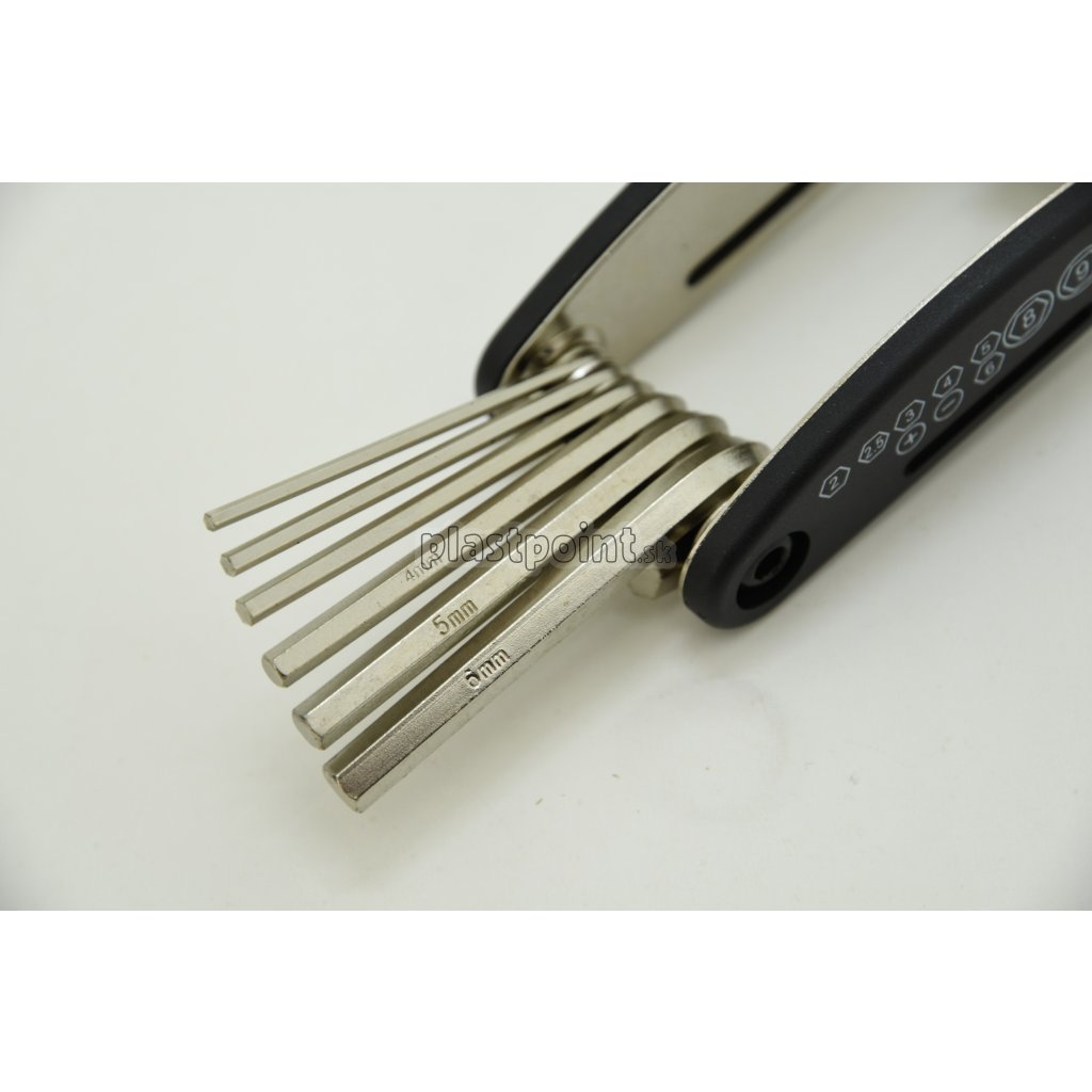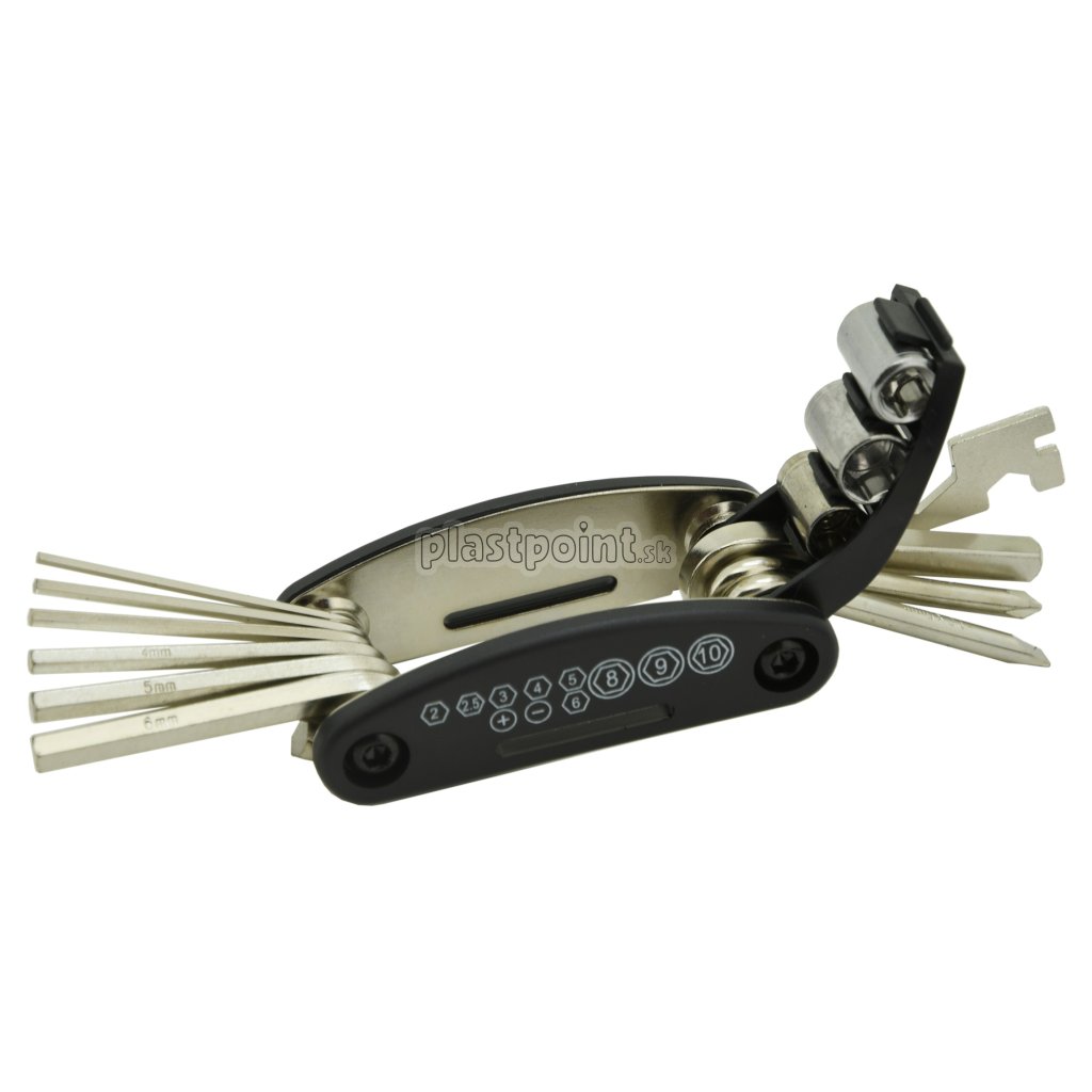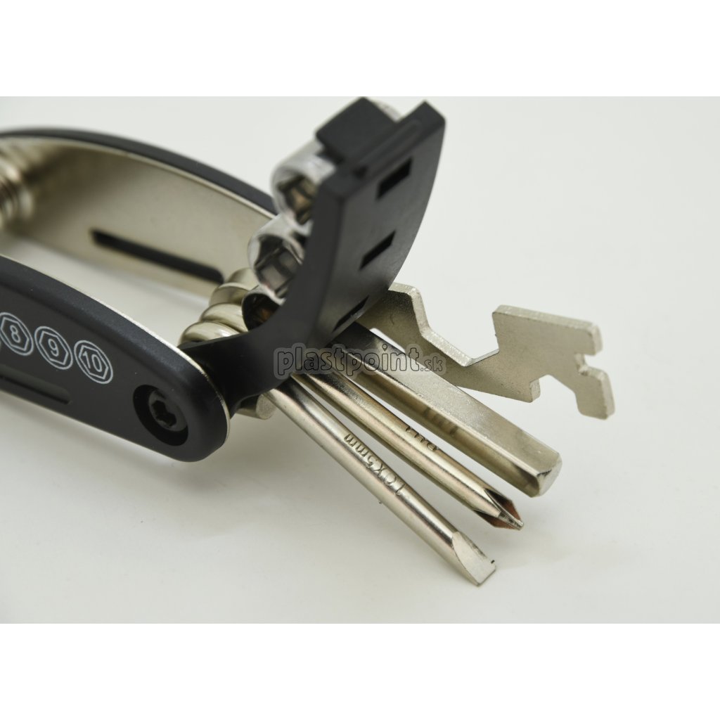 Multitool je zložený z 6x imbusových kľúčov (2/2,5/3/5 skrutkovača, stranovým kľúčom (8/10/15 mm a kľúčom 14GE na výplet kolies) av neposlednom rade štvorhranným skrutkovačom spolu s HEX nástavcami (8/9/10 mm).