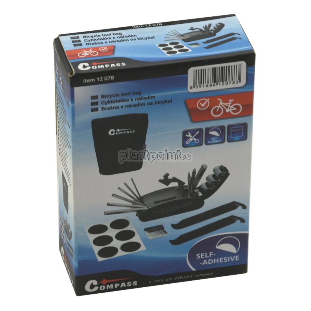 Praktická taška s multifunkčným nástrojom a samolepiacimi záplatami na duše, s ľahkým uchytením na bicykel pomocou pásika so suchým zipsom.