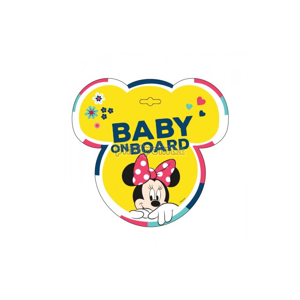 Ceduľka s prísavkou Baby on board Minnie. Prichytenie na okno v aute pomocou priehľadnej prísavky.