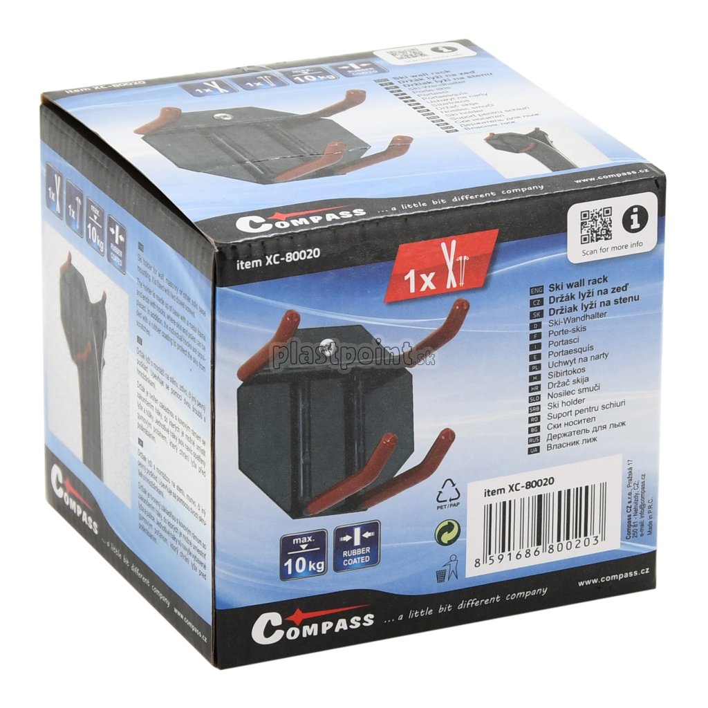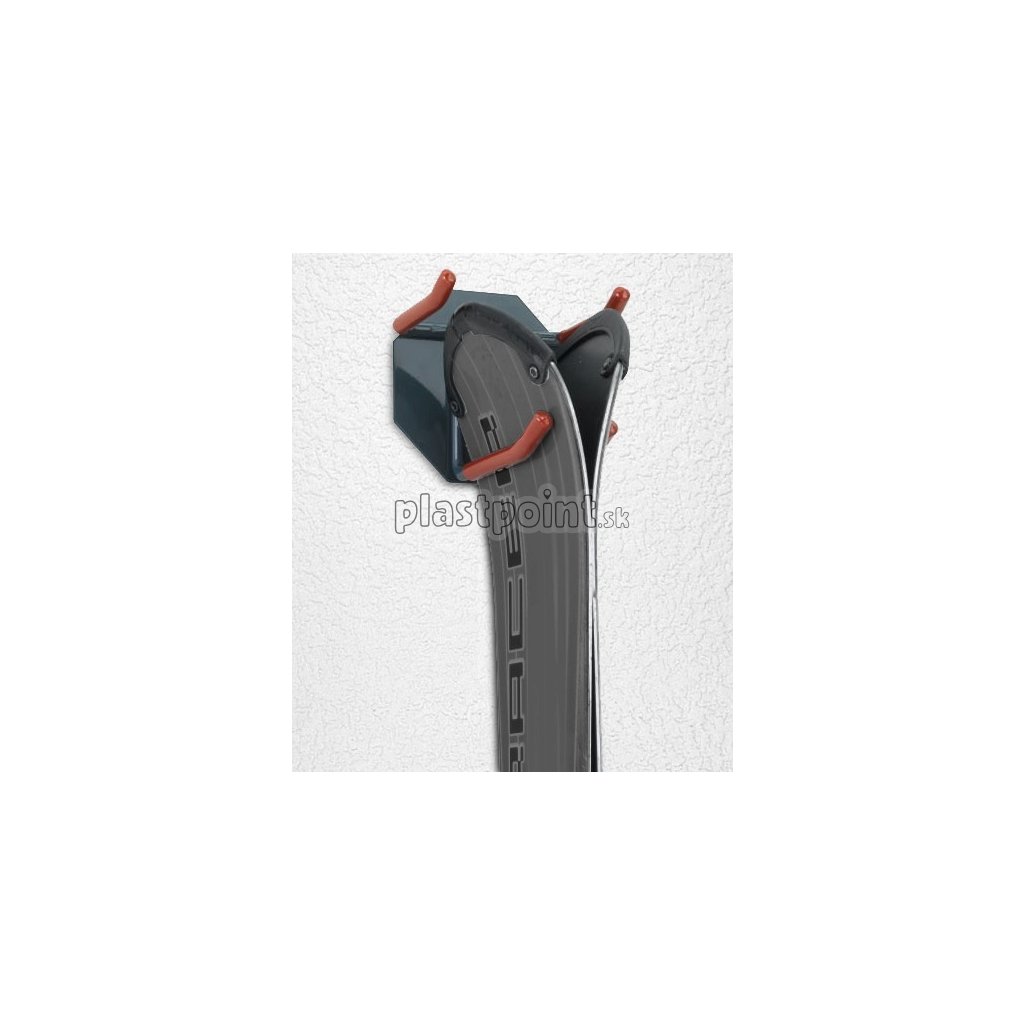 Držiak je celokovový a je tvorený pevnou základňou a zostavou hákov, na uskladnenie páru lyží a paličiek. Háky sú navyše opatrené gumou, ktorá zabraňuje poničeniu a zároveň funguje ako protišmyková vrstva.