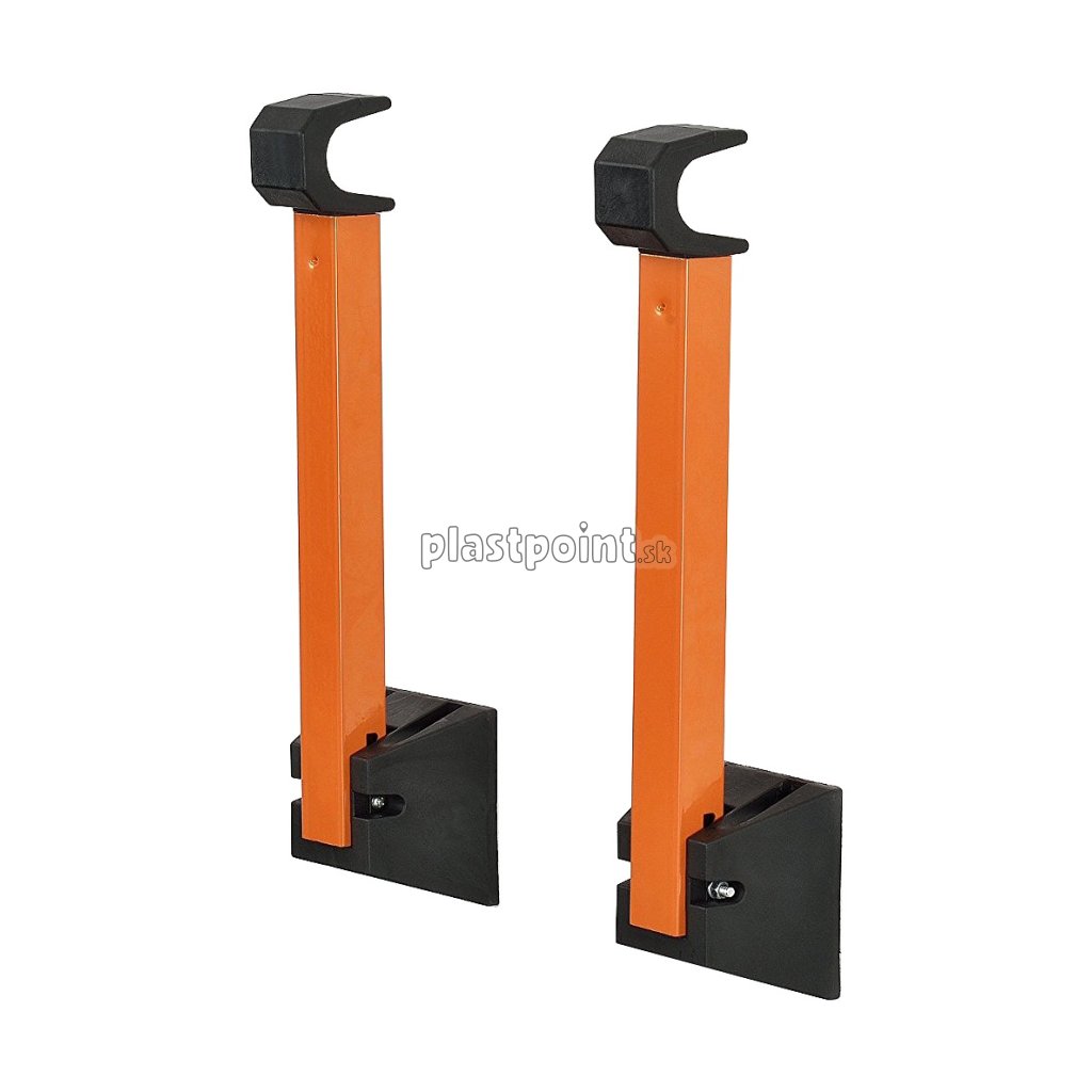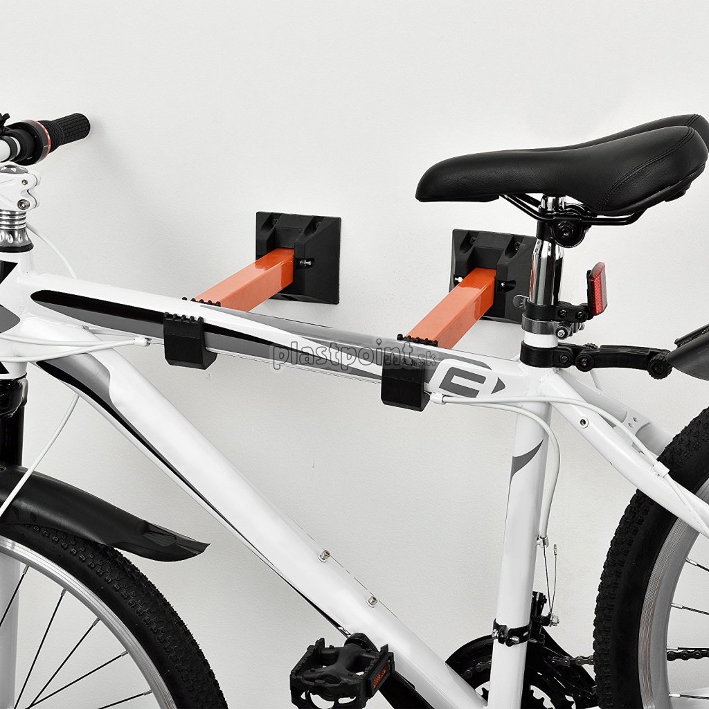 Dvojdielny, sklápací držiak bicykla určený na montáž na stenu.