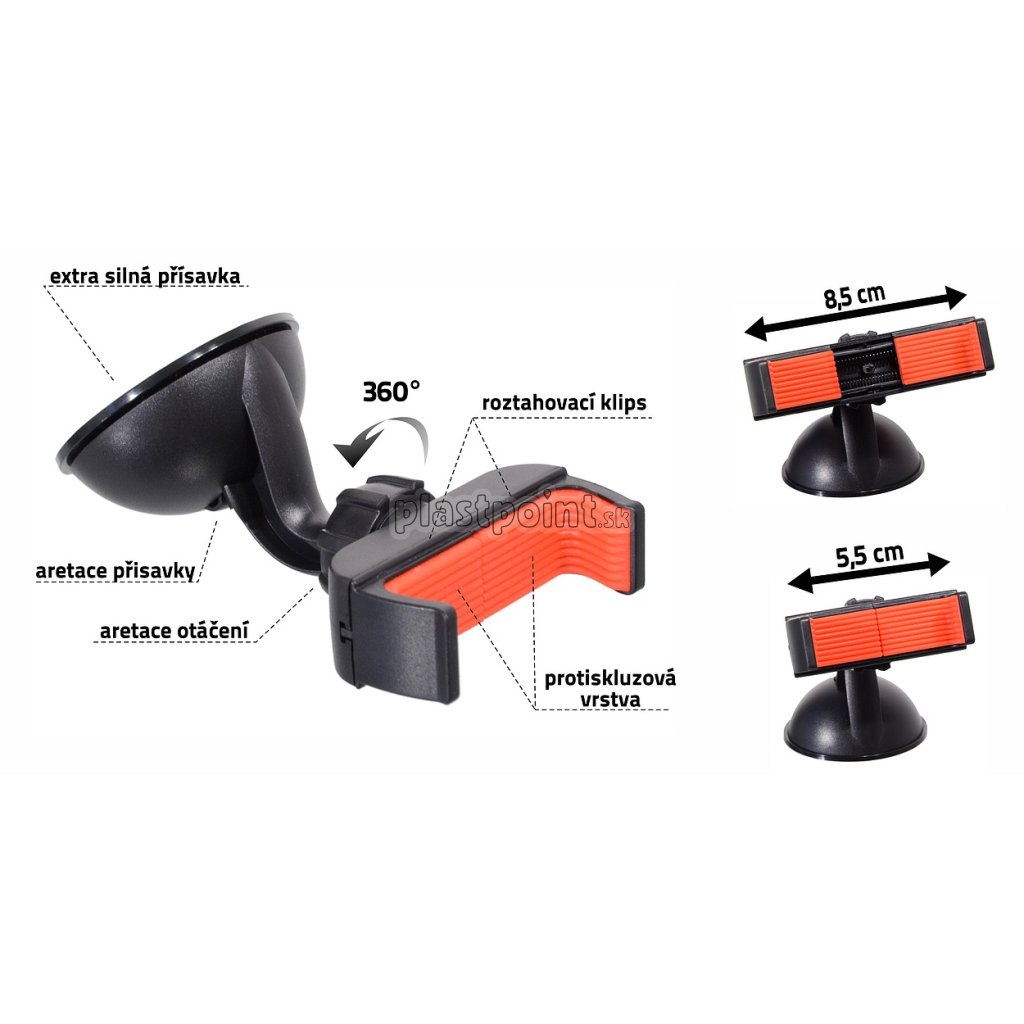 Držiak telefónu s extra silnou prísavkou a klipsom pre uchytenie telefónu šírky 5,5 – 8,5 cm.