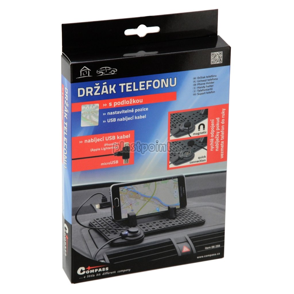 Podložka s držiakom na telefón, vybavená nabíjacím USB káblom s konektorom pre iPhone 5 a vyššie a zároveň s konektorom microUSB pre telefóny Samsung, HTC, Huawei, Lenovo a ďalších.