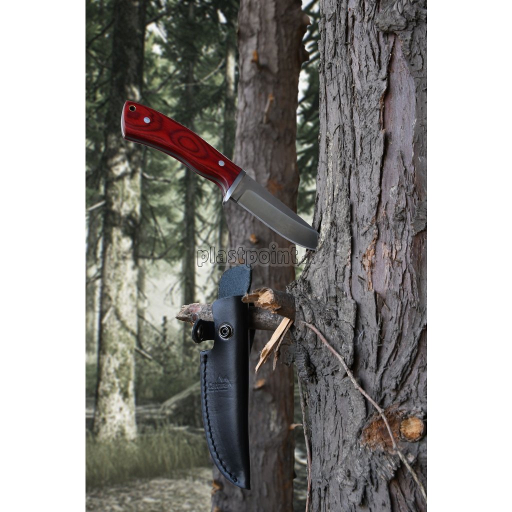 Rukoväť je osadená precízne opracovanými črienkami z vyrezávaného Pakkawood červenej farby, nôž perfektne padne do ruky a je opatrený zarážkou chrániacou nositeľa pred porezaním. puzdro na zavesenie na opasok, nôž tak môžete nosiť kdekoľvek v prírode so sebou. cm