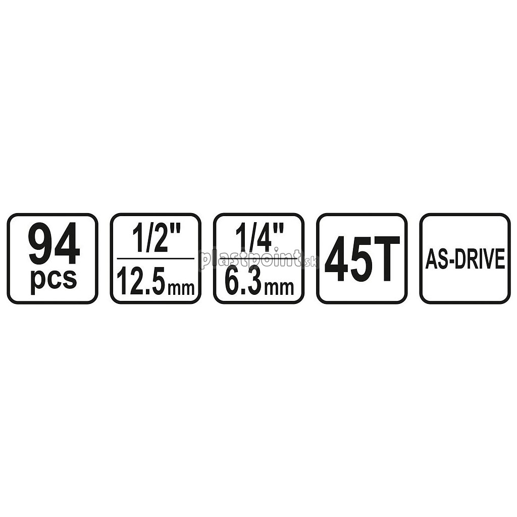 Sada obsahuje dve račne, celý rad bitov, adaptérov, nástavcov 1/2'a 1/4' všetko usporiadané v prehľadných pozíciách.
