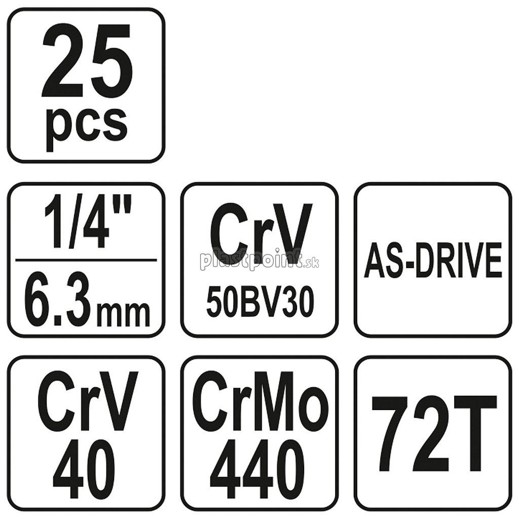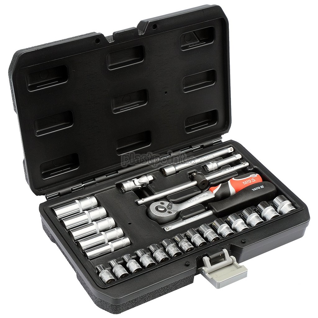 Gola sada 1/4" obsahuje 25ks: nástavcov, predlžovacích nástavcov, račňu s plastovou rukoväťou a ďalšie príslušenstvo. Vyrobené z kvalitnej ocele CrV50BV30, CrV40, CrMo440 s funkciou AS-DRIVE. Račňa má jemný 72 zubý chod.