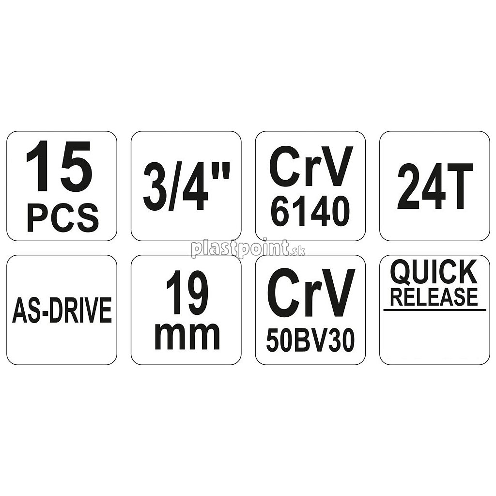 Gola sada 3/4" obsahuje 15ks: nástavce, račňu a ďalšie príslušenstvo. Vyrobené z kvalitnej chrómvanádiovej ocele CrV6140 a CrV50BV30 s funkciou AS-DRIVE.