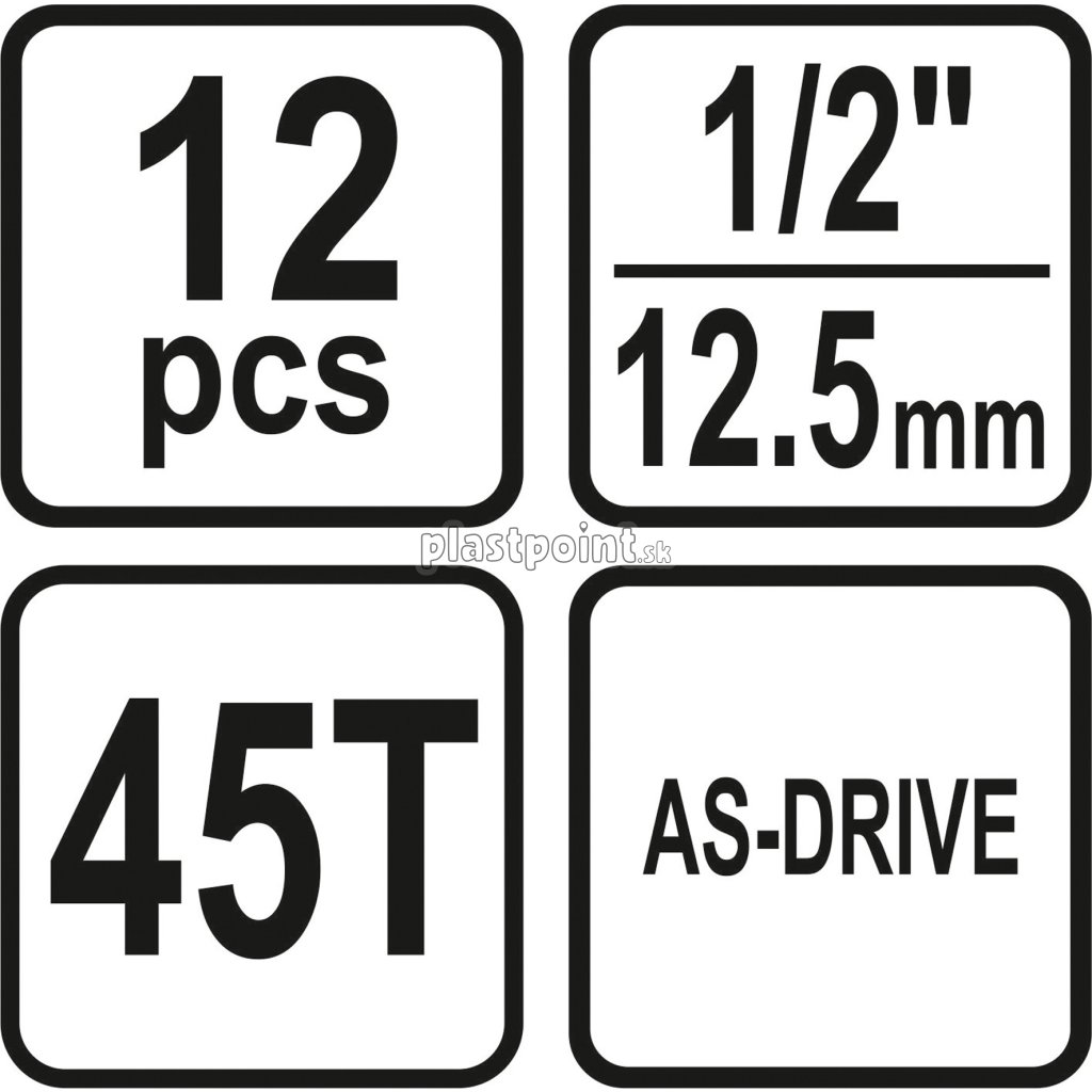 Gola sada 1/2" obsahuje 12ks: nástavce a račňu s plastovou rukoväťou. Vyrobené z kvalitnej ocele s funkciou AS-DRIVE.