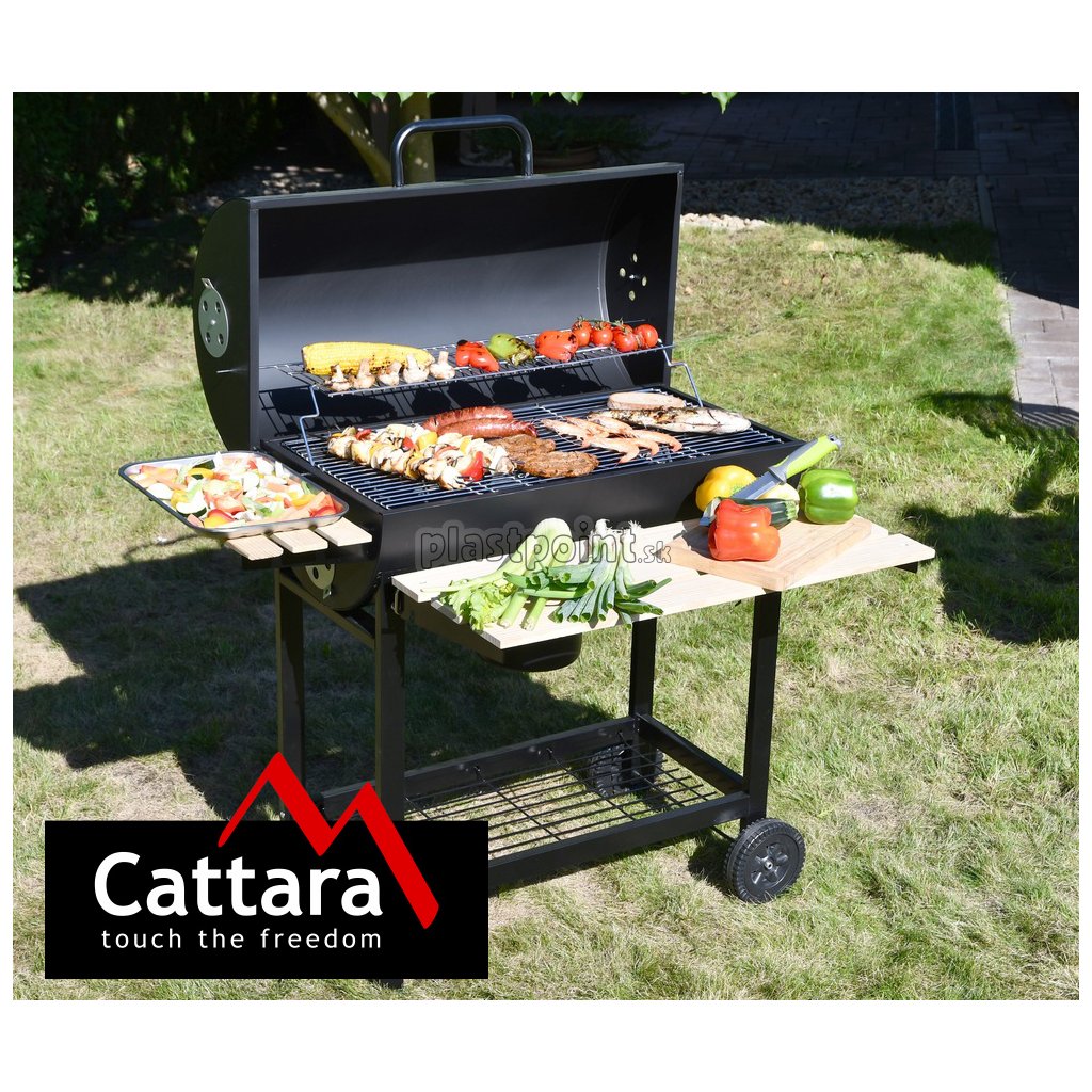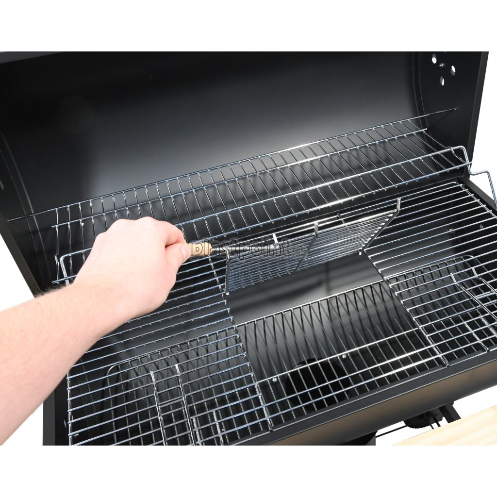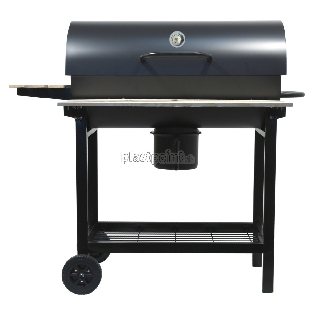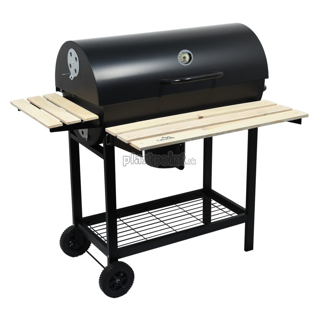 Veľký záhradný gril na drevené uhlie s rozmernou grilovacou plochou a celým radom odkladacích priestorov.