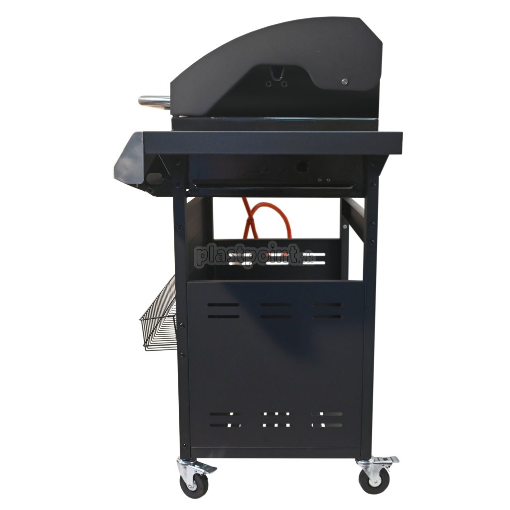 Hlavný grilovací priestor (56 x 45 cm) je vybavený osadiť nádobami na drevené uhlie a bez pripojenej plynovej fľaše tak gril použiť iba na drevené uhlie. Každý horák má vlastnú reguláciu a piezo zapaľovania. Priestor tiež disponuje odkladacím roštom na udržanie teplých pokrmov ( 55 x 16 cm ).