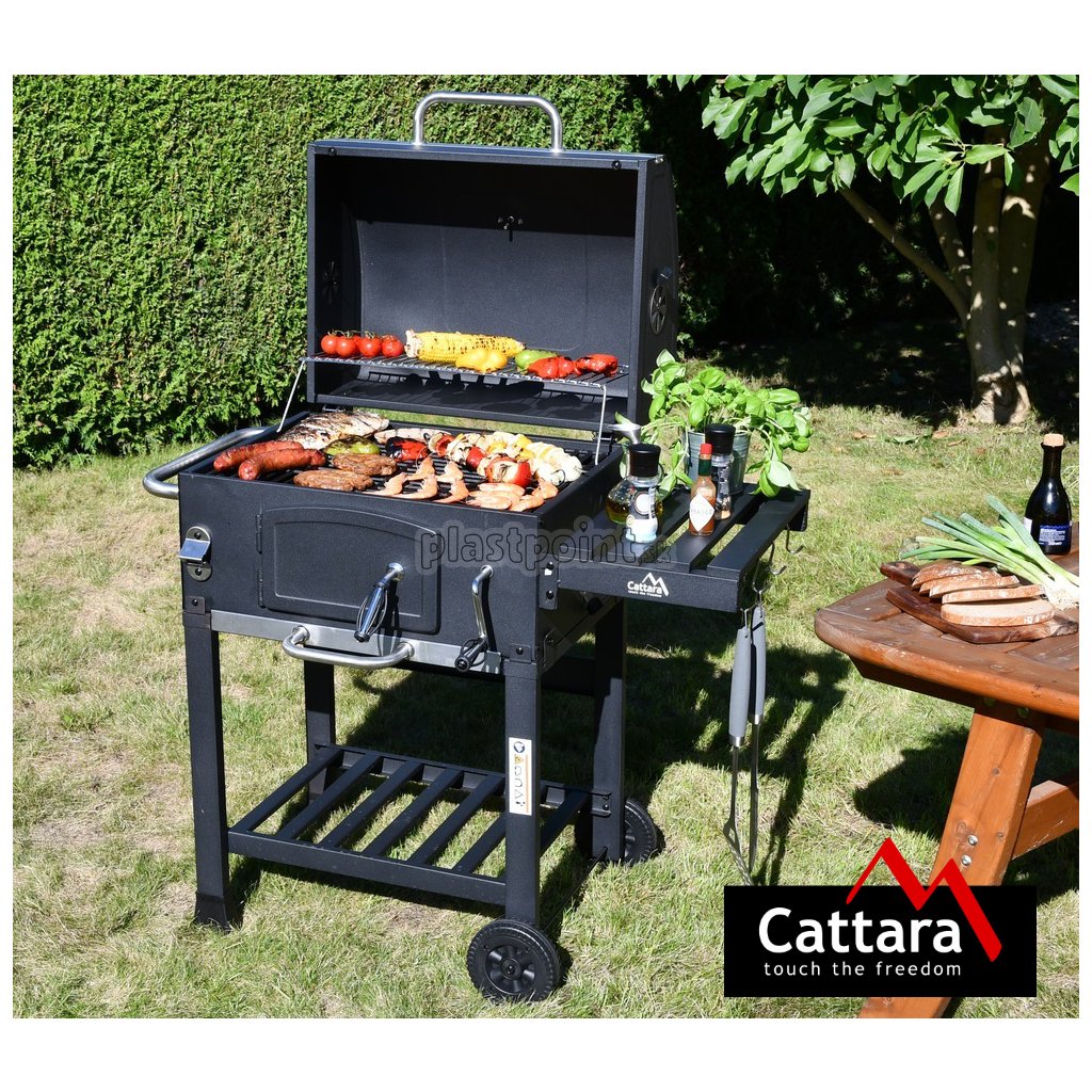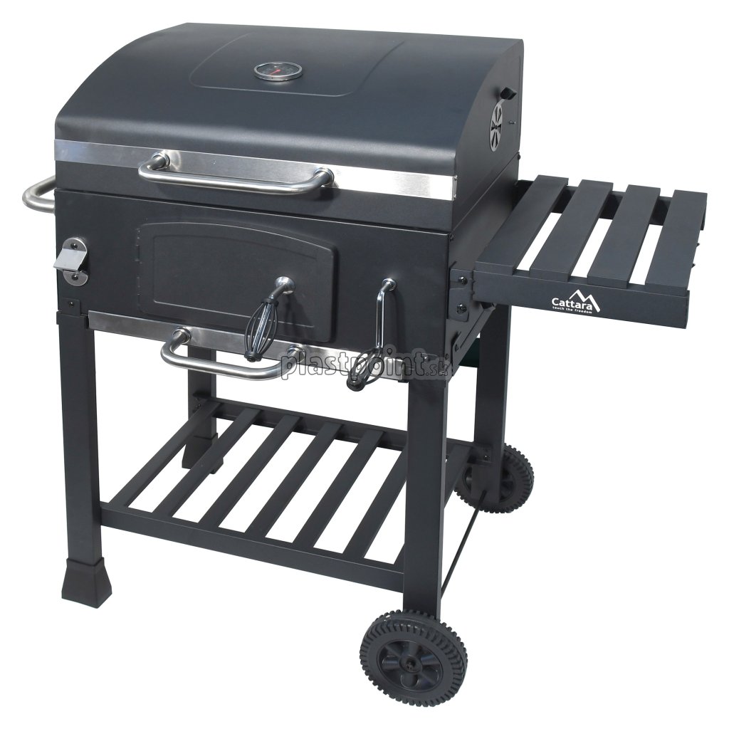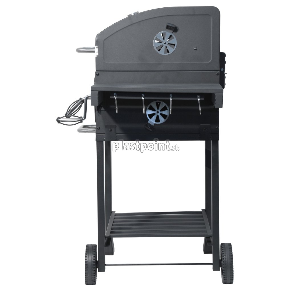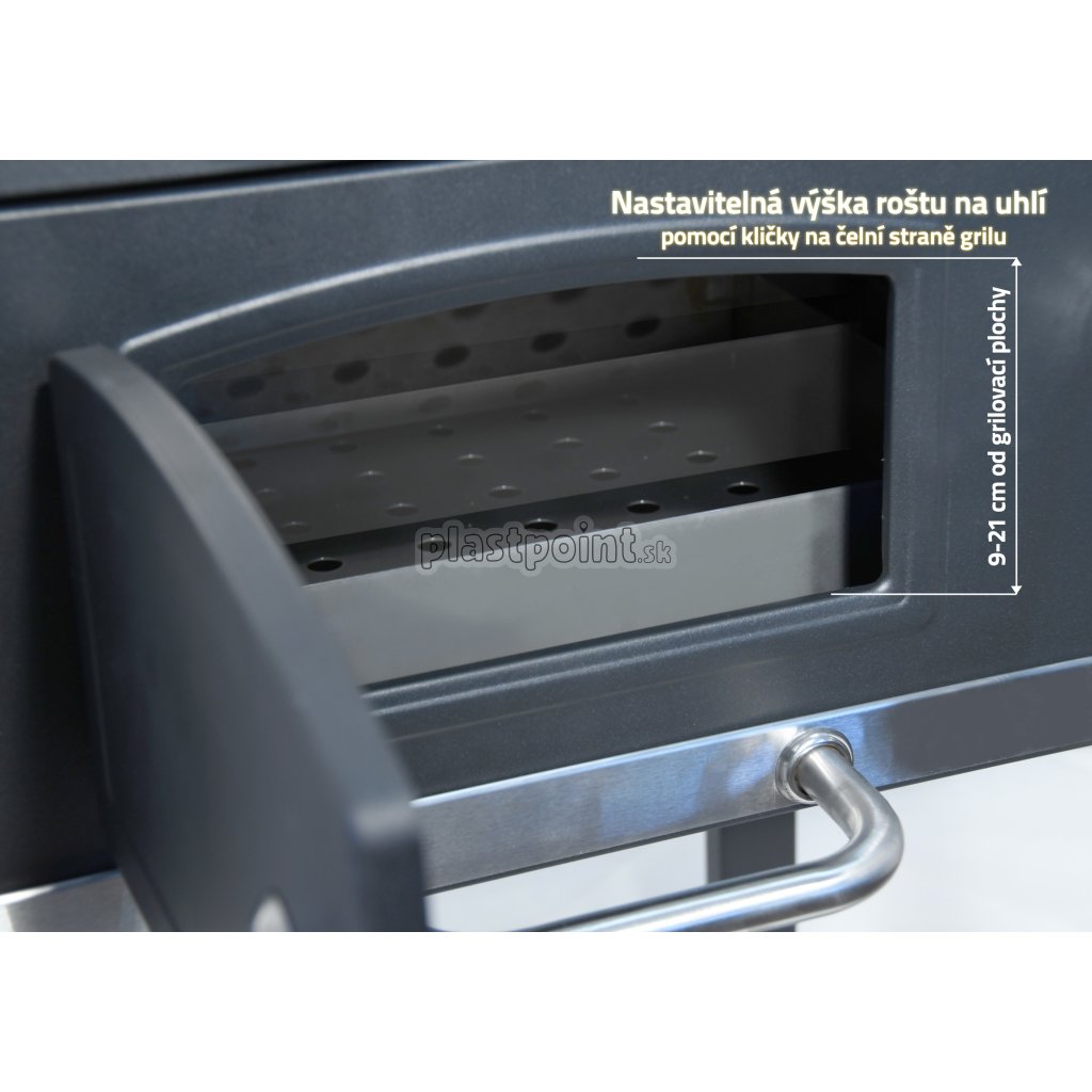 Konštrukcia z ocele je opatrená hrubou čiernou farbou. Madlá a ovládacie kovové prvky, majú dostatočné rozmery pre pohodlný úchop a zaisťujú precízne ovládanie. Obojstranná regulácia ventilácie perfektne lícuje s konštrukciou. Ďalšou prednosťou je rošt na uhlie s nastaviteľnou výškou 9-21 cm od grilovacieho priestoru, pomocou kľučky na prednej strane. Dvierka na čelnej strane grilu uľahčujú doplňovanie uhlia.