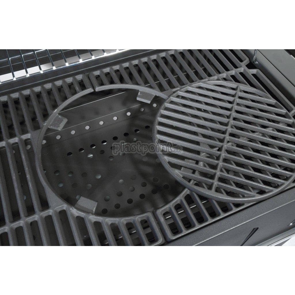 Pre samotnú tepelnú prípravu Vašich pochutín je gril opatrený robustným, trojdielnym, liatinovým roštom s okrúhlym stredom. Miesto strednej časti je po vybratí možné umiestniť napr. grilovacie panvice, pizza kameň a podobné (priemer 28-29 cm). Ďalej je grilovací priestor osadený odkladacím roštom na udržanie teploty už hotových pokrmov, alebo na ich predhriatie.