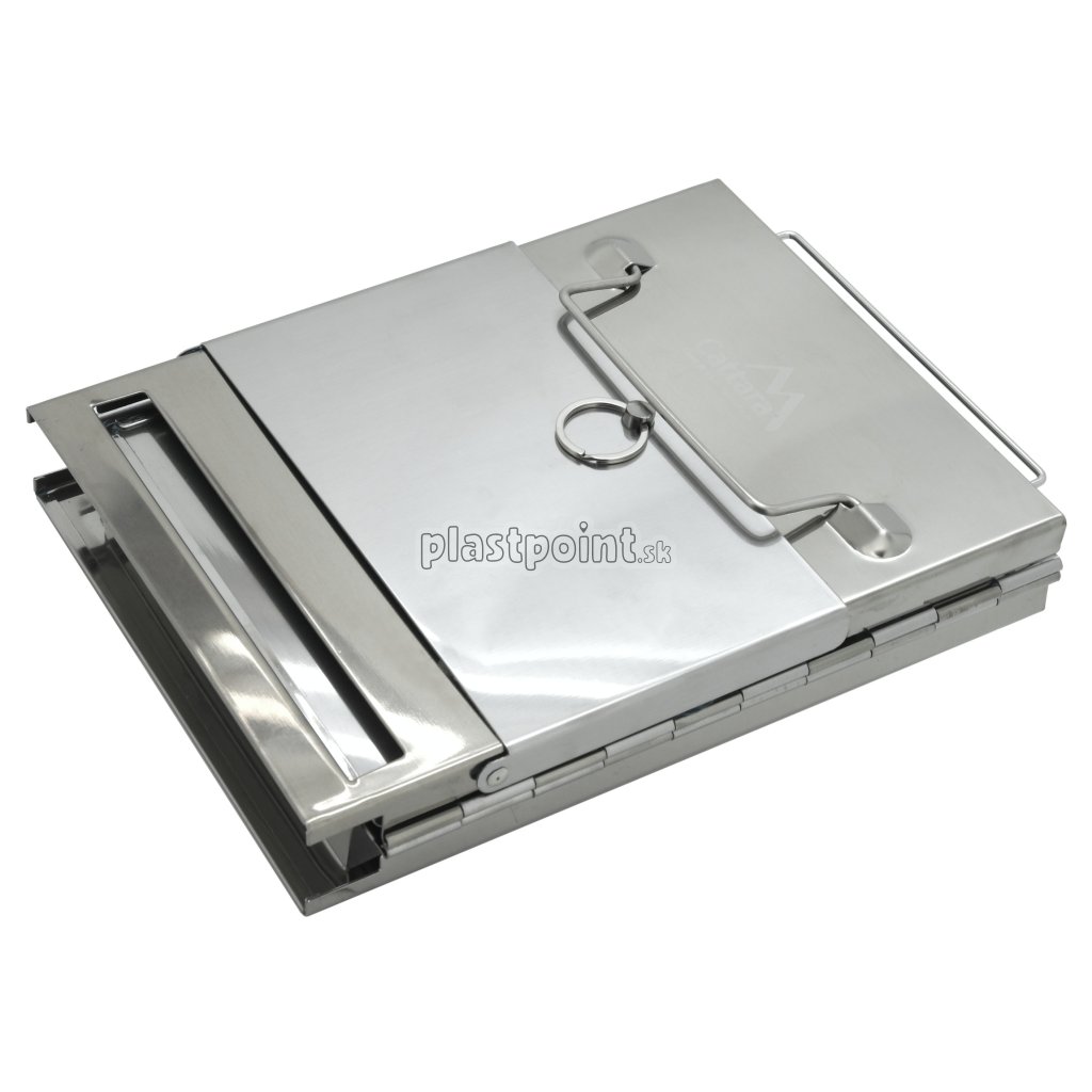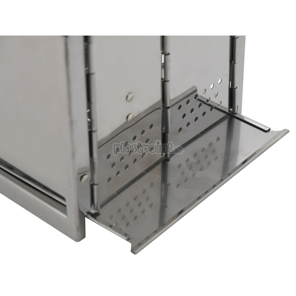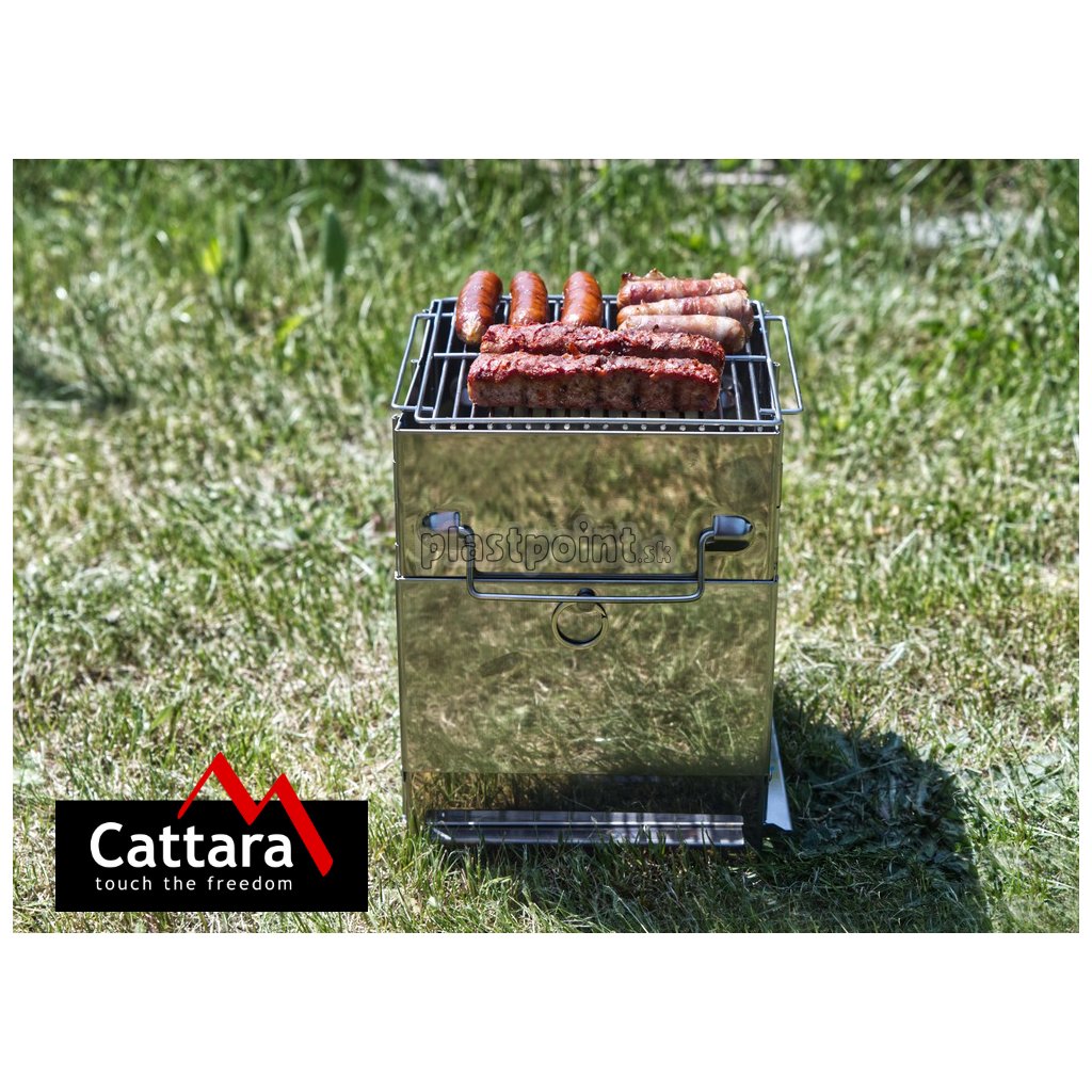 Konstrukce je vyrobena z kvalitní nerezové oceli s lesklým povrchem. Stabilita je zajištěna složením konstrukce. Rozměry grilu 22 x 21 x 27 cm.