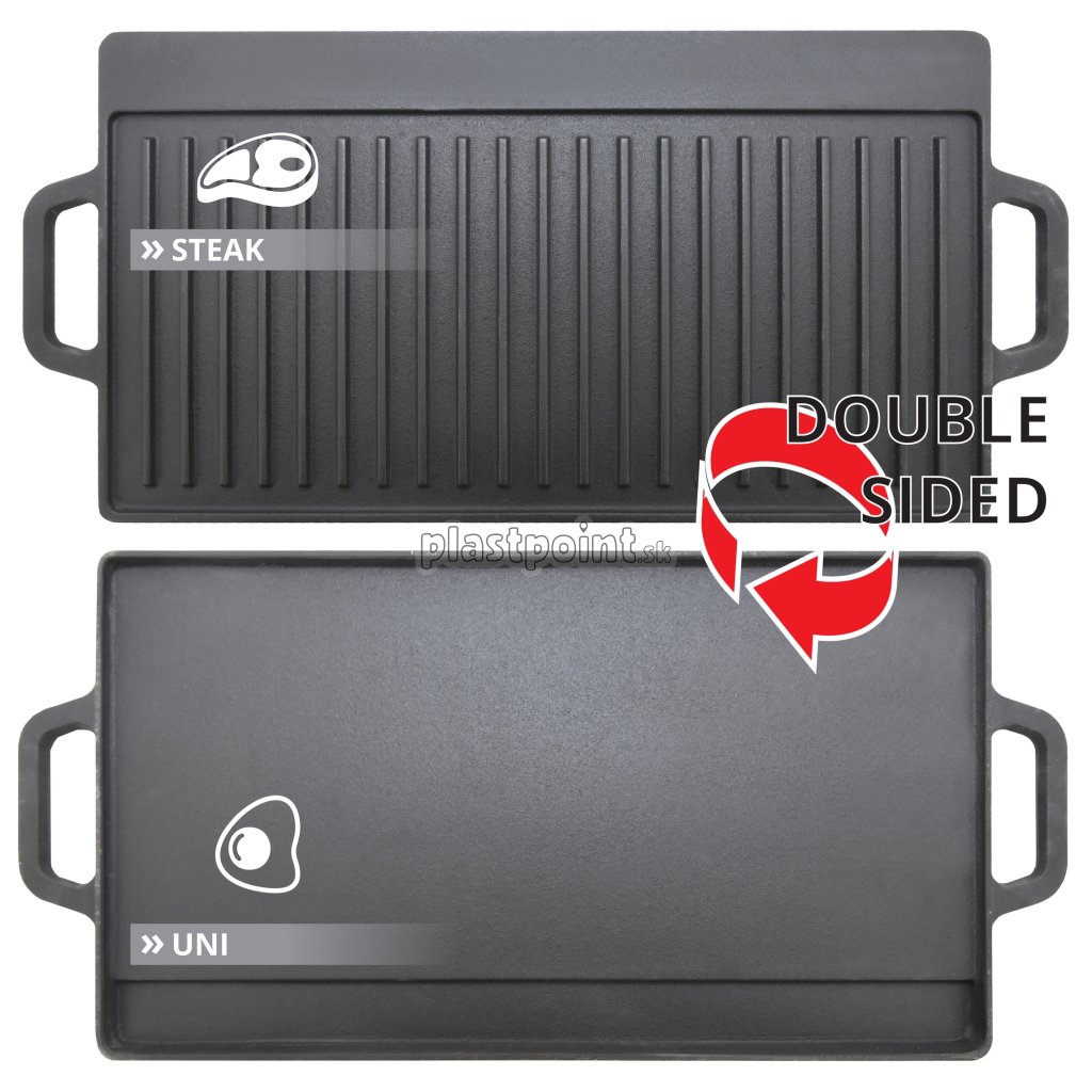 Je obojstranný a ponúka priestor na tepelnú úpravu mäsitých pokrmov s typickou drážkovanou štruktúrou.