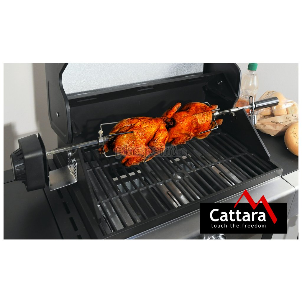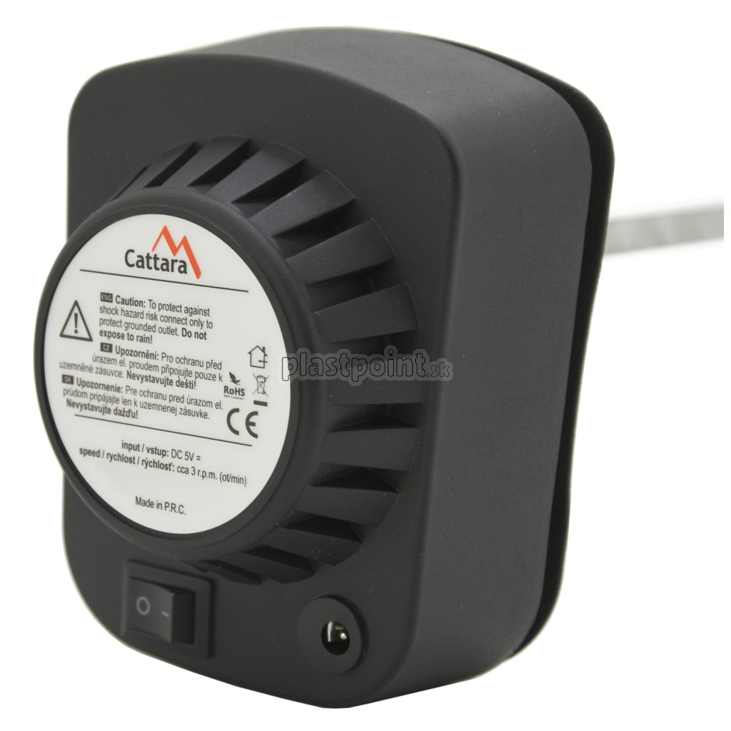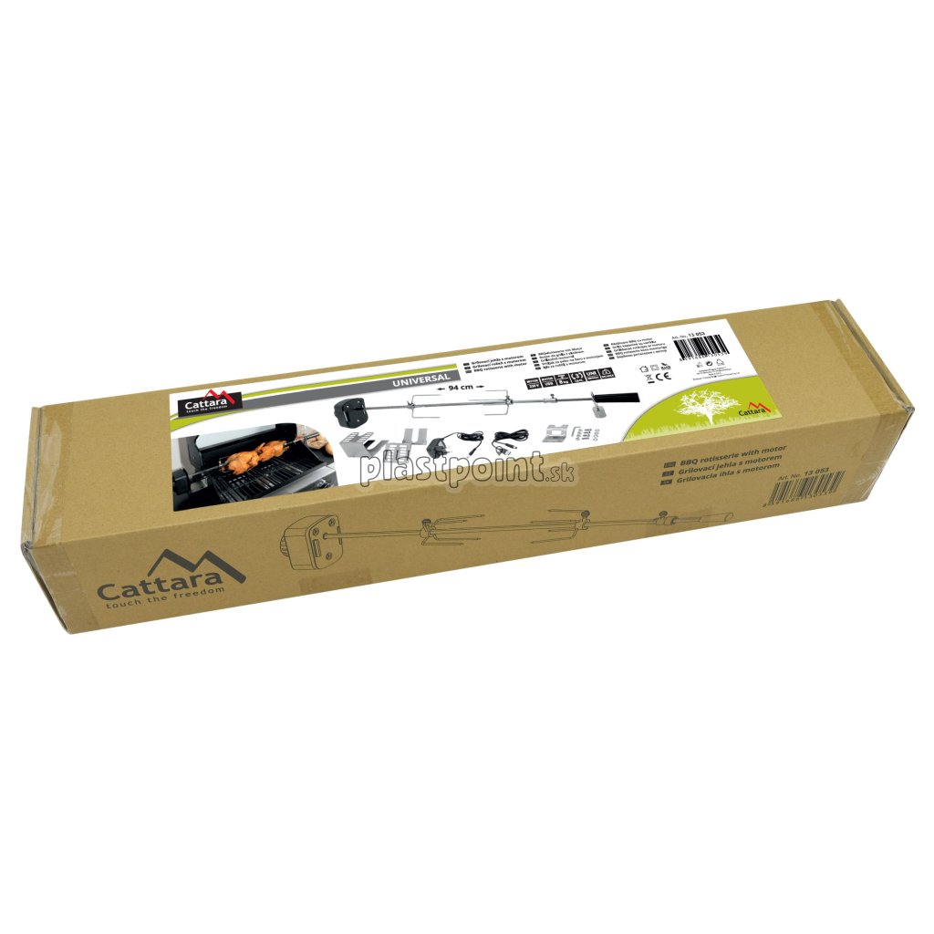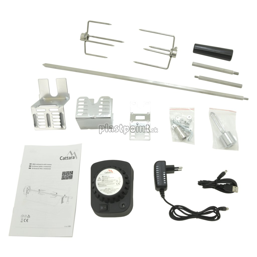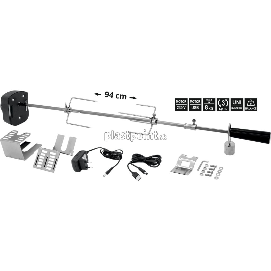 Motor disponuje rýchlosťou 3 otáčky za minútu, čím zaisťuje rovnomerné grilovanie kurčiat, špízov a rôznych blokov mäsa, postupne zo všetkých strán. Motor je možné napájať zo štandardnej zásuvky 230 V, alebo pomocou USB kábla (5V) napríklad z powerbanky.