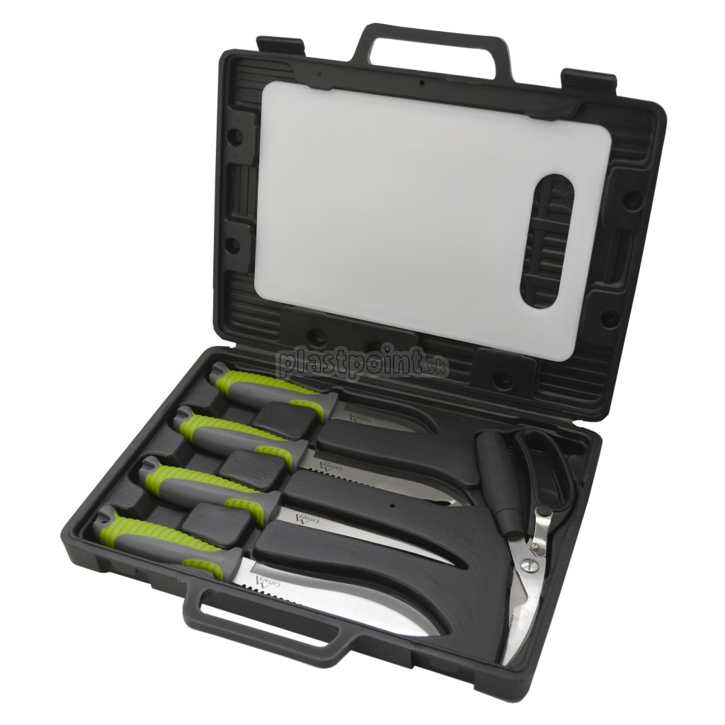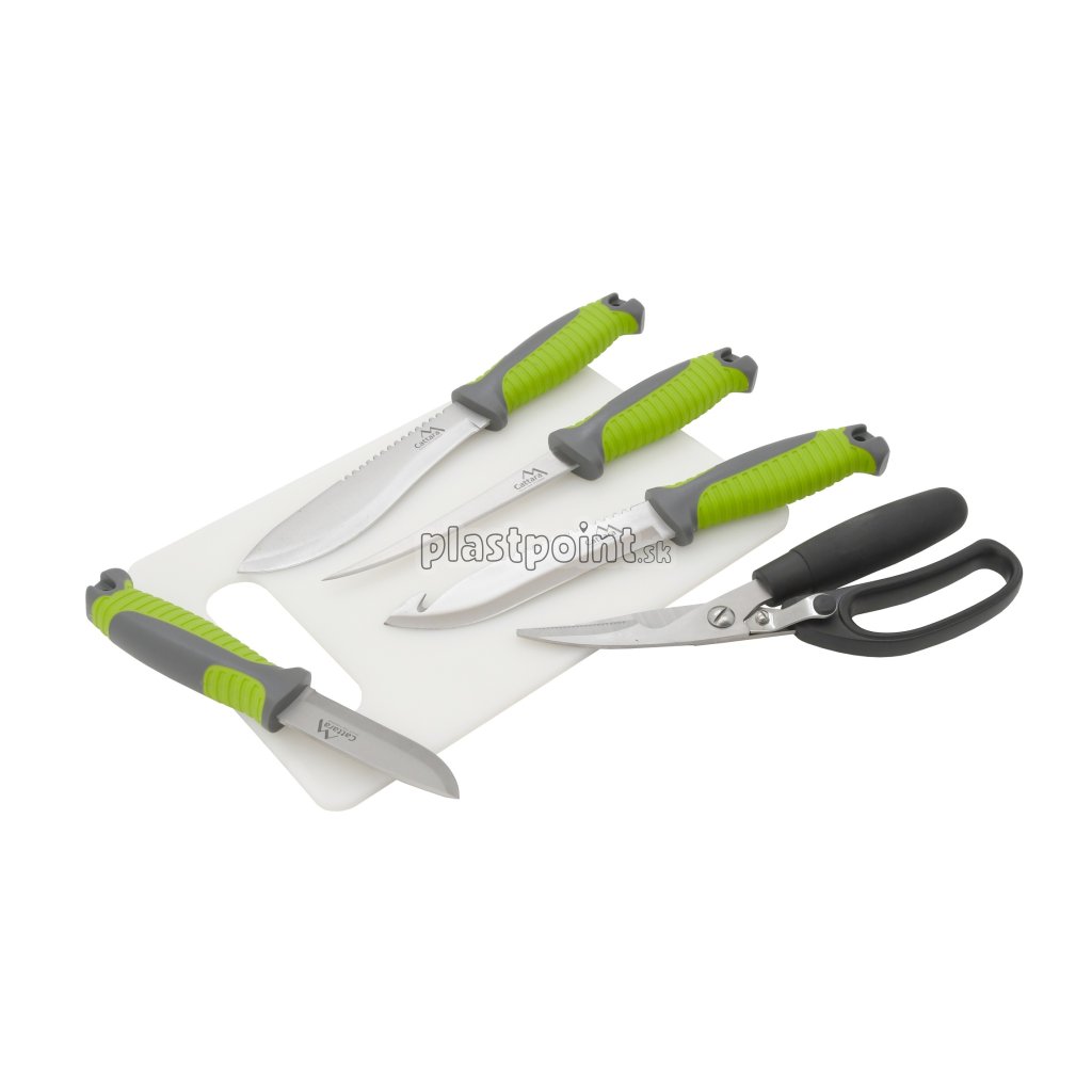 Grilovacia sada skladajúca sa zo 4 ks nožov, nožníc na hydinu a ryby a doštičky pre pohodlné porciovanie.