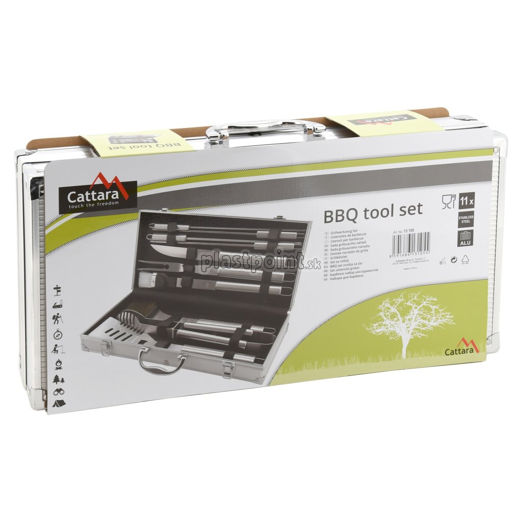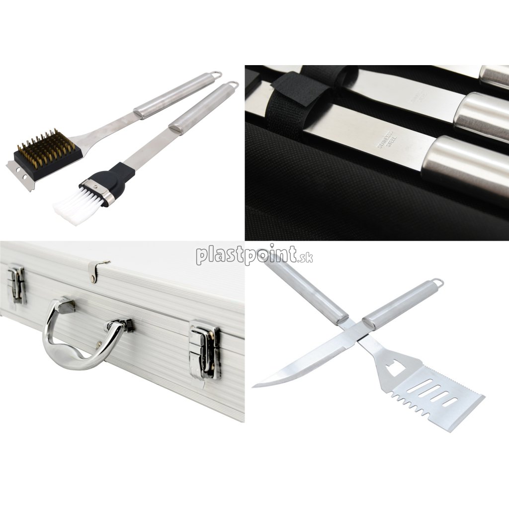 V sade sa nachádza obracačka s precízne zabrúsenou hranou vybavená zúbkovaným ostrím, otváračom zátok a otvormi na odtok. Kliešte, špeciálne tvarované pre istý úchop najrôznejších pokrmov, kefu na údržbu grilu, kedy samotná kefová časť je z mosadze. Nepostrádateľnou časťou grilovacieho náradia je aj dvojzubá vidlička, štetec so štetinami z nylonu, na potieranie, či mašľovanie pokrmov, porcovací nôž a 4x grilovacie ihlice s hrotmi brúsenými do špičky. čistenie. Rukoväte jednotlivých nástrojov sú kruhového prierezu a výborne padnú do ruky. Všetky nástroje je možné zavesiť na háčik.