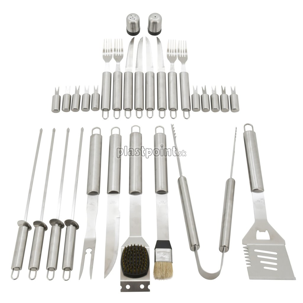 Sada obsahuje všetky nástroje na prípravu a konzumáciu najrôznejších pokrmov, ale aj následnú údržbu grilu. Všetky nástroje sú navyše kvalitne spracované z nerezovej ocele.