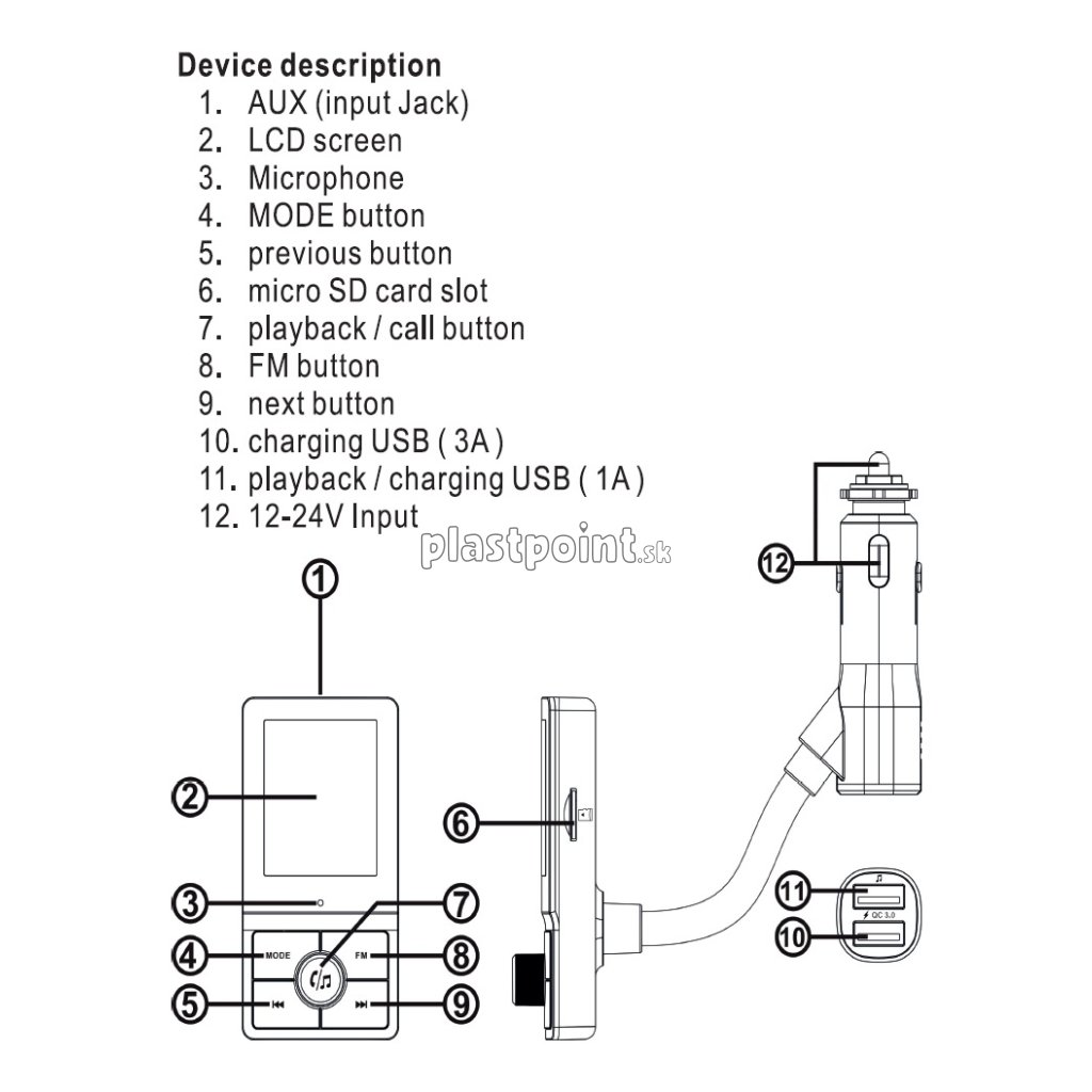 Vysielač je vybavený farebným LCD displejom s ovládacími tlačidlami pre jednoduché ovládanie všetkých funkcií. Zariadenie je kompatibilné so zásuvkami autozapaľovačov 12/24V osobných aj nákladných vozidiel. / 1000mA