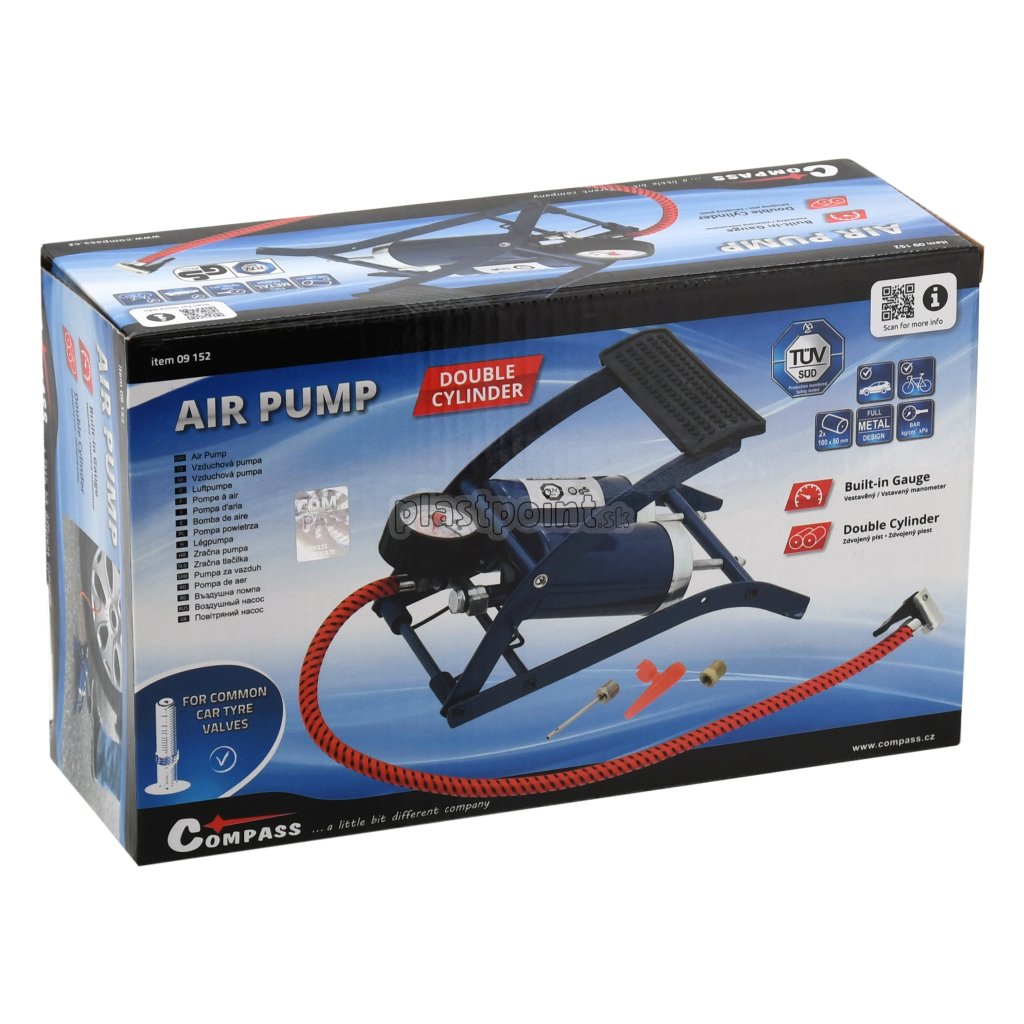 Klasická hustilka osadená dvoma piestami, ktorá je určená na hustenie pneumatík automobilov, motocyklov, bicyklov, matracov, lôpt atp.