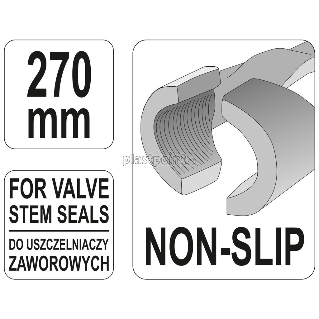 Kliešte sú opatrené úzkymi, tvrdenými, vrúbkovanými čeľusťami Non-Slip, slúžiacimi na bezpečné stiahnutie tesnenia drieku ventilov.