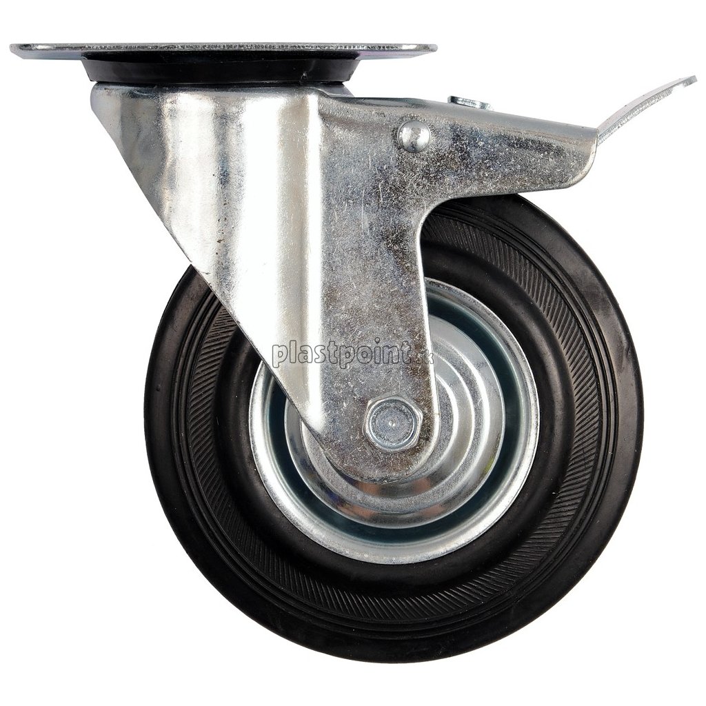 Otočné koliesko, ktorého základňa má 4 montážne otvory, ochranné bočné štíty a brzdu. K plynulému chodu otáčania prispieva obojstranné guličkové ložisko.