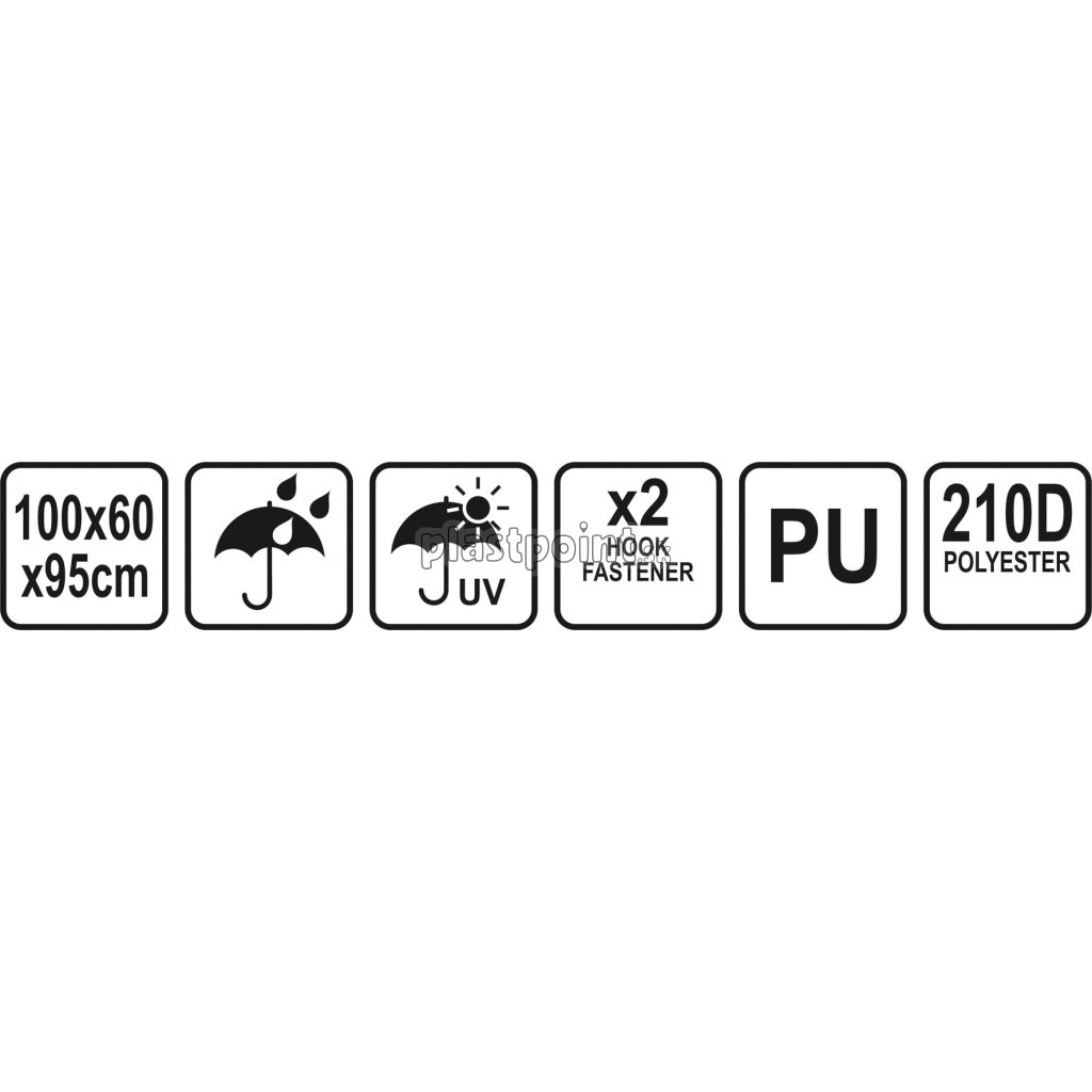 Rozmery krytu 100 x 95 x 60 cm, lichobežníkového tvaru, vhodné pre grily LUND TO-99512, TO-99586, TO-99588, TO-99519, TO-99 rozmery.