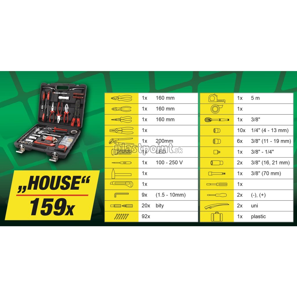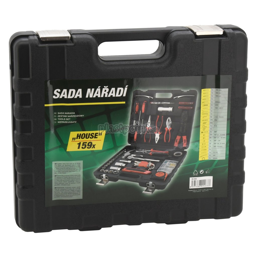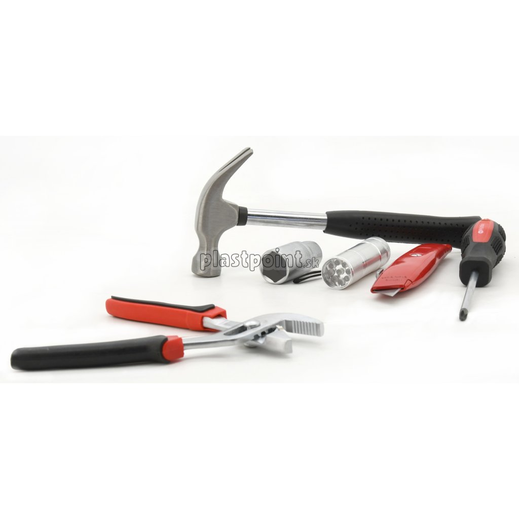 Sada obsahuje ergonomické skrutkovače, imbusové kľúče, žiletkový nôž, najbežnejšie typy klieští vrátane elektrikárskych, kladivo, 3/8" račňu s nástavcami, LED svietidlo, skrutkovač na bity vrátane 20ks bitov, svin. Okrem iného je sada vybavená puzdrom s 92 ks spojovacieho materiálu.