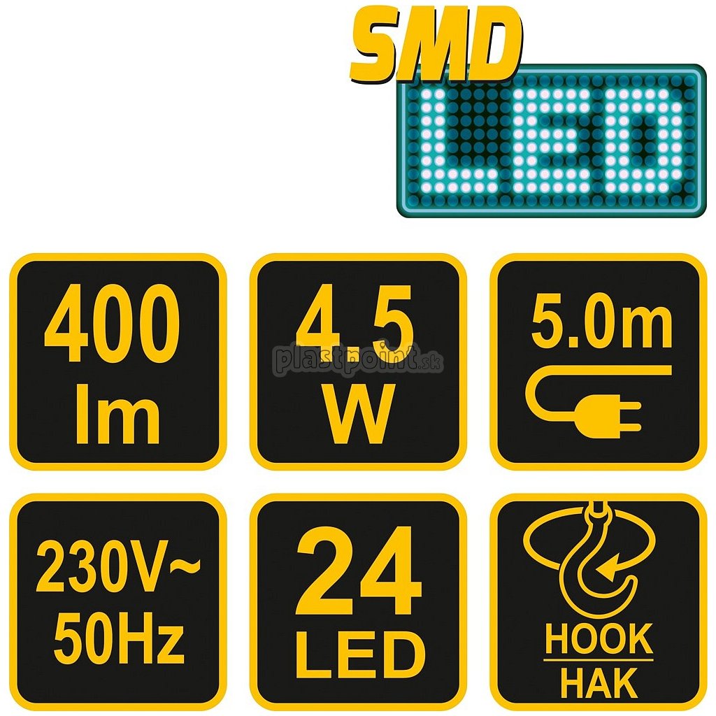 Montážna lampa s napájaním zo zásuvky 230 V, osadená 24x SMD LED s výkonom 4,5 W vyžarujúca svetelný tok 400 lm vo farbe chromatickosti 4000K.