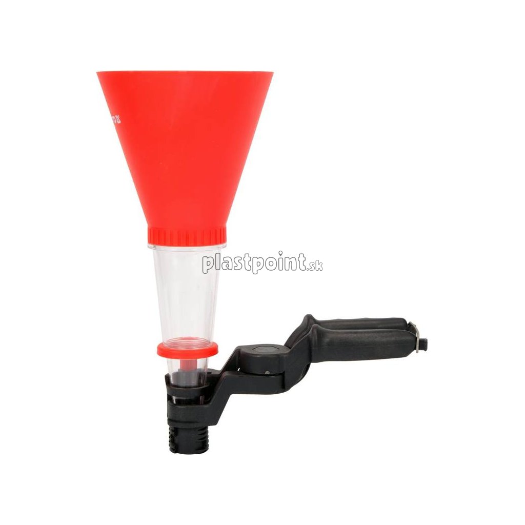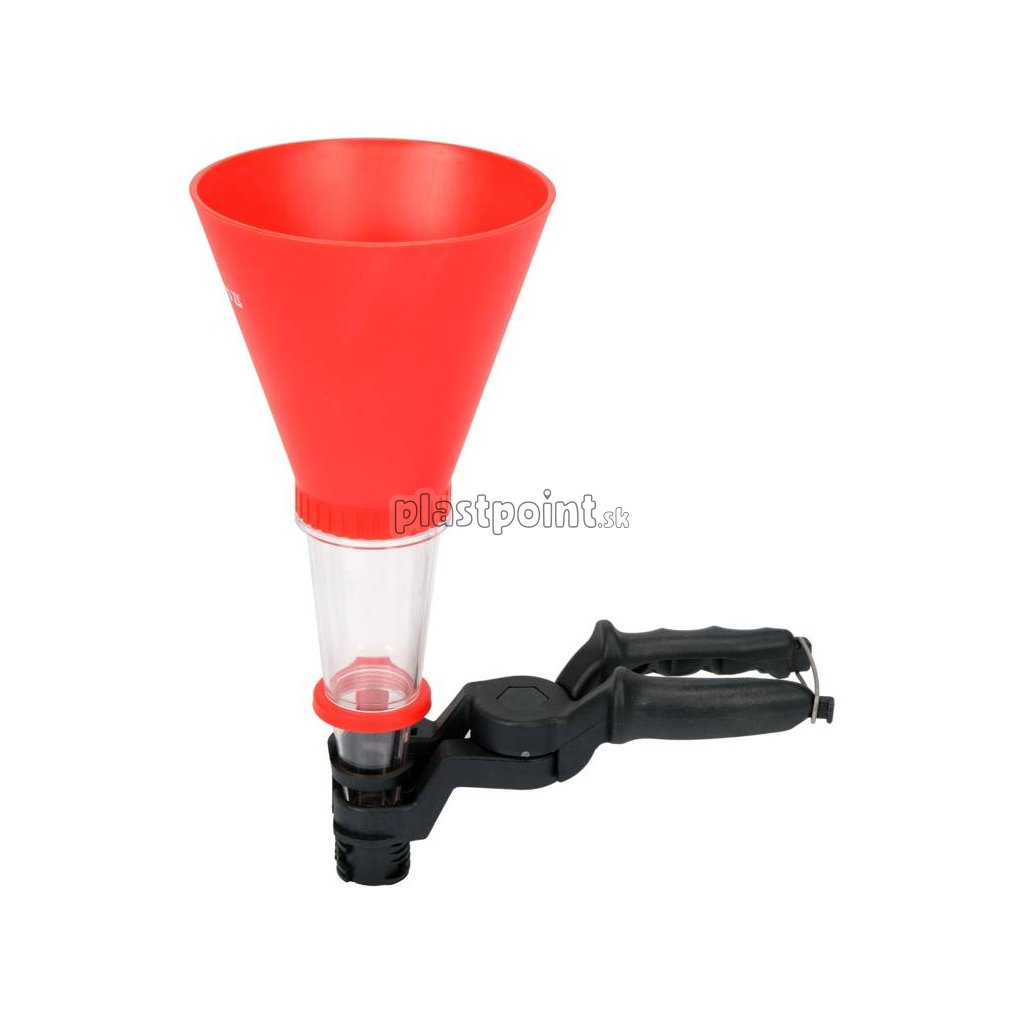 Praktický lievik s držadlom a nastaviteľnou svorkou.