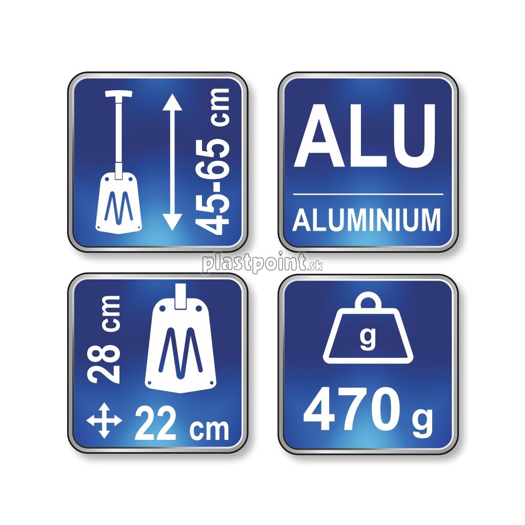 Lopata je okrem ergonomickej, plastovej rukoväte tvorená kompletne z hliníka. Násada je vysúvacia, lopata tak má celkovú dĺžku 65 cm. Lyžica s rozmermi 22 x 28 cm je zhotovená v zlatej povrchovej farebnej úprave. Vďaka malým rozmerom v zloženom stave je lopata veľmi vhodná do kufra auta, kde môže byť neustále po ruke.65 cm rozmery zloženej lopaty 22 x 45 x 8 cm rozmery lyžice 22 x 28 cm g