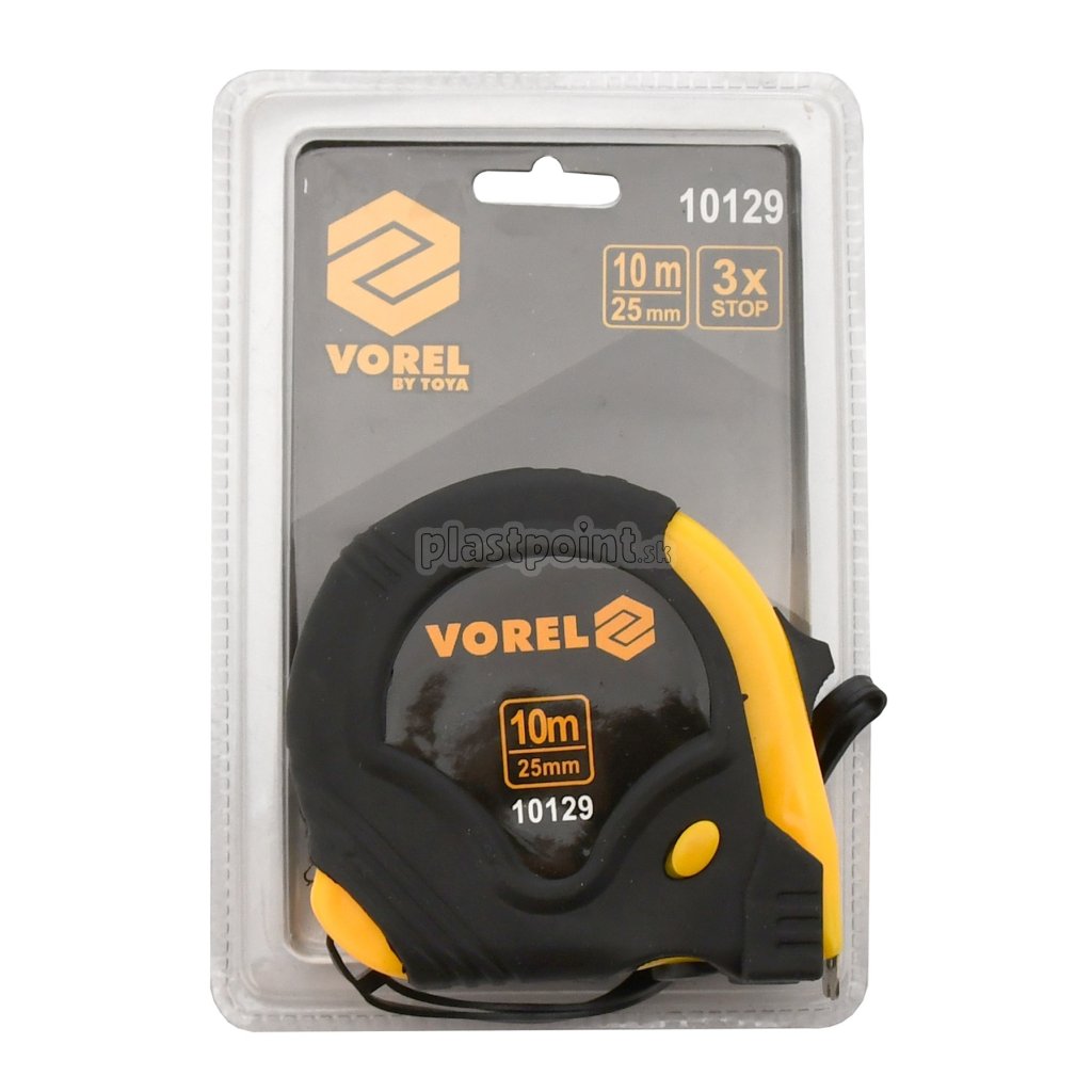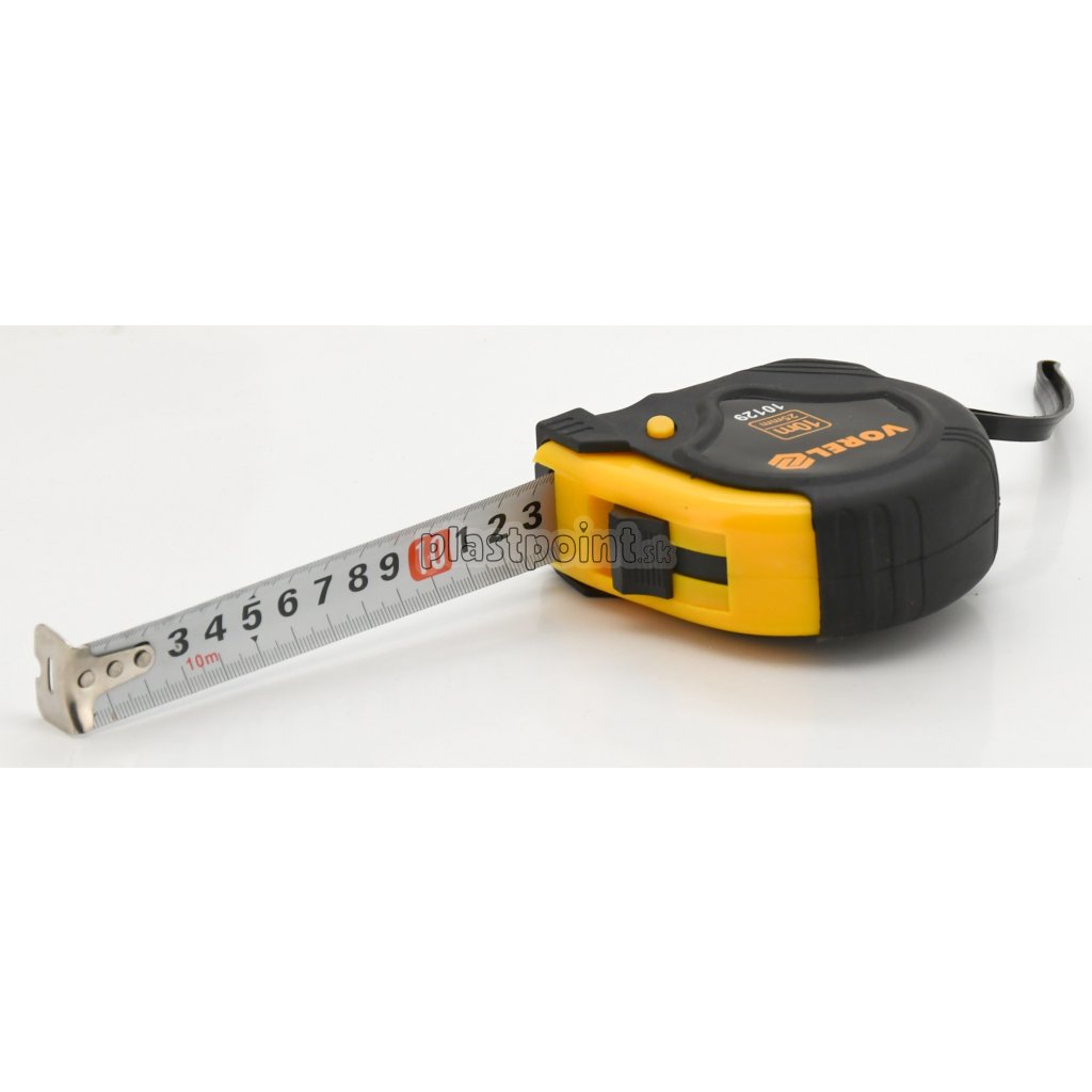 Zvinovací meter 10 m dlhý a 25 mm široký zakončený pohyblivým háčikom. Puzdro je vyrobené z plastu, vystužené gumovými podložkami a aretačným gombíkom.