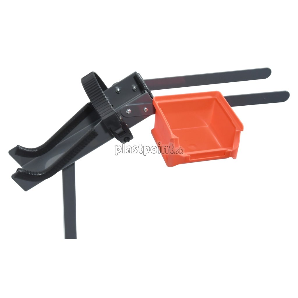 Uchytenie kolesa je prevedené pomocou podstavca pre rám, opatreného gumovými návlekmi, chrániace koleso pred poškriabaním. Rám je potom upnutý pomocou nastaviteľnej pásky s istiacim strmeňom a predné koleso je zabezpečené pred otáčaním pomocou predĺženia, ktoré je ďalej doplnené o odkladaciu priehradku. Stojan je vhodný pre najrôznejšie tvary rámov kolies do šírky 60 mm. 105 cm