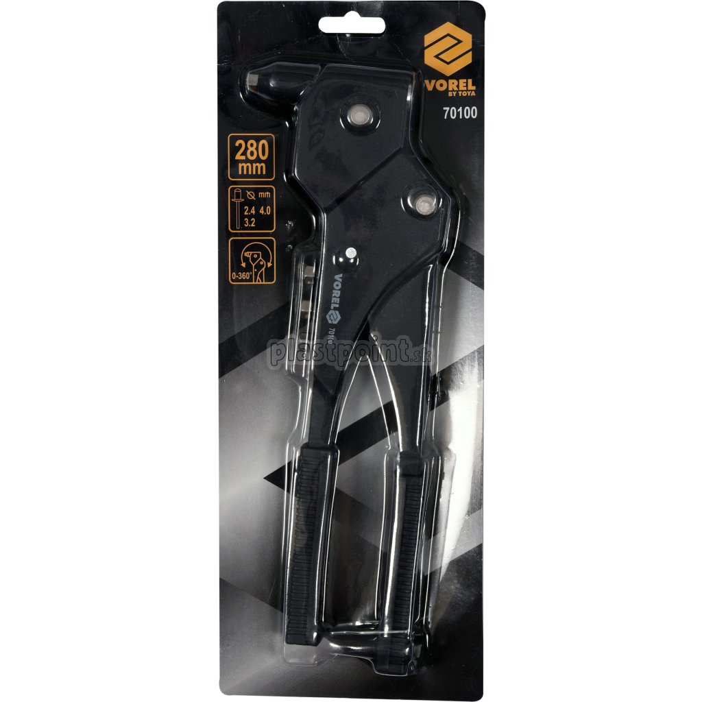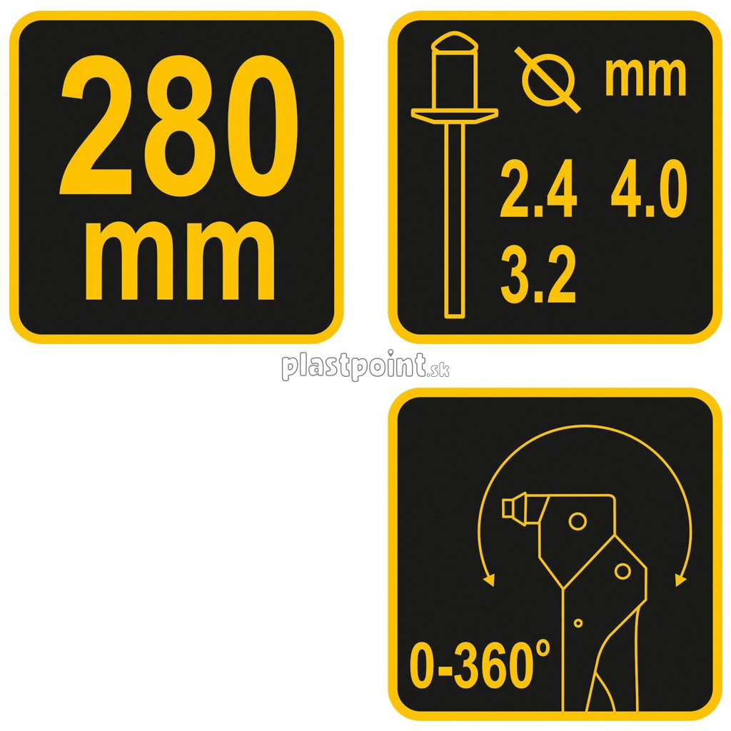 Nitovacie kliešte dĺžky 280 mm s otočnou hlavou, pre nity 2,4 - 4,0 mm.