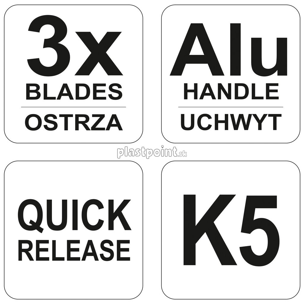 Súprava obsahuje 3 ks čepieľok z uhlíkovej ocele K5. Telo nástroja je zhotovené z hliníka.