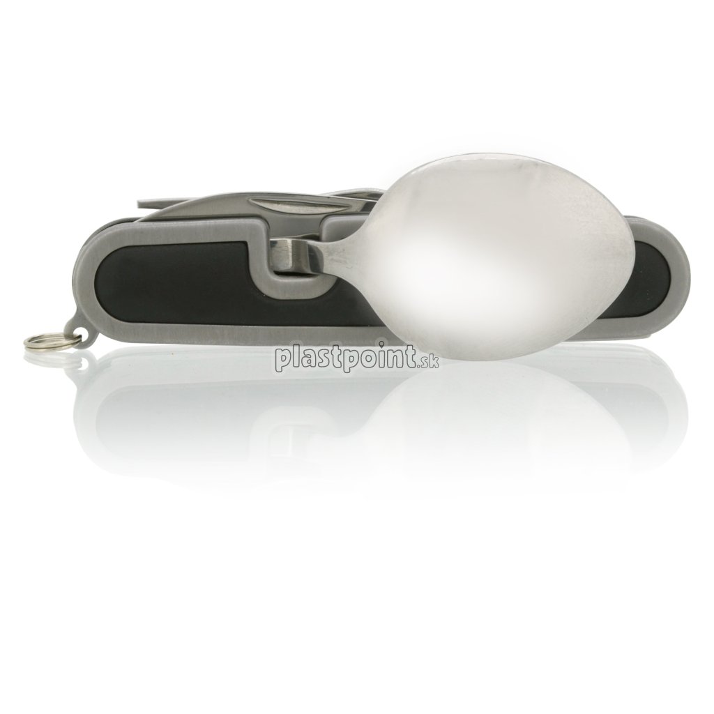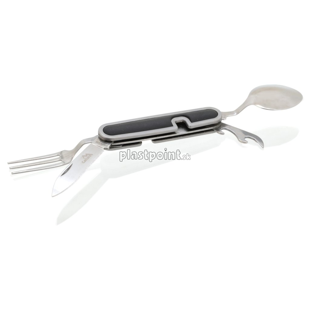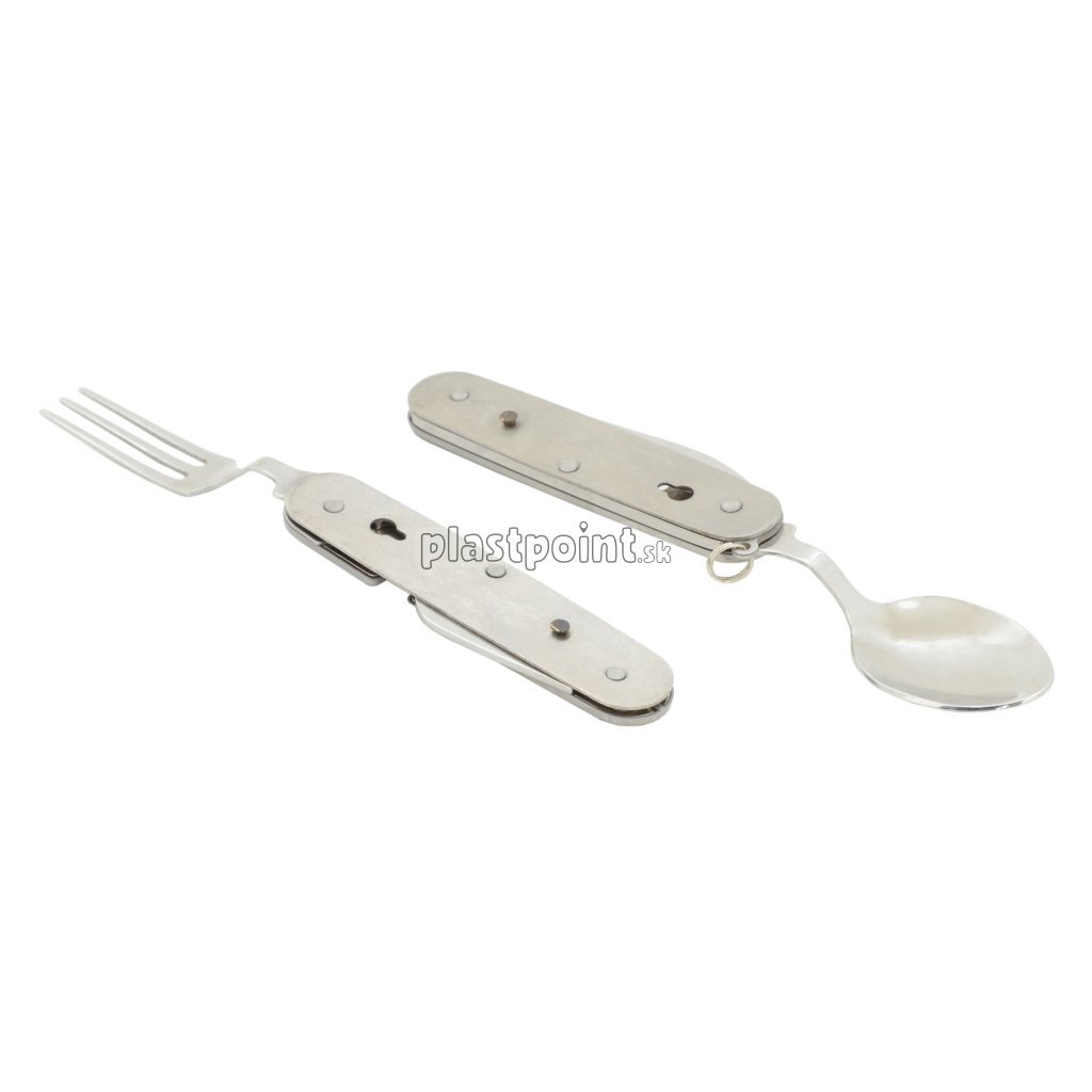 Prvá časť noža sa skladá z vidličky, otvárača na plechovky a viečka fliaš, druhá časť skrýva lyžicu a samotnú čepeľ noža.